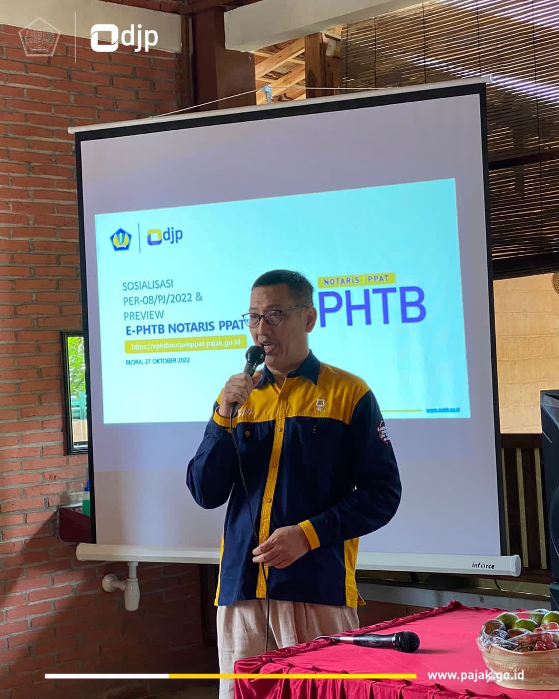 Kantor Pelayanan Pajak (KPP) Pratama Blora menyelenggarakan kegiatan sosialisasi peraturan perpajakan (PER-08/PJ/2022) kepada Notaris dan/atau Pejabat Pembuat Akta Tanah (PPAT), serta bimbingan teknis penggunaan Aplikasi e-PHTB (Pengalihan Hak Atas dan Bangunan) di Blora (Kamis, 27/10).
