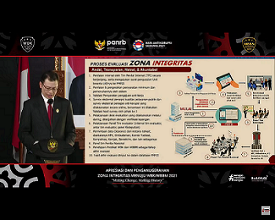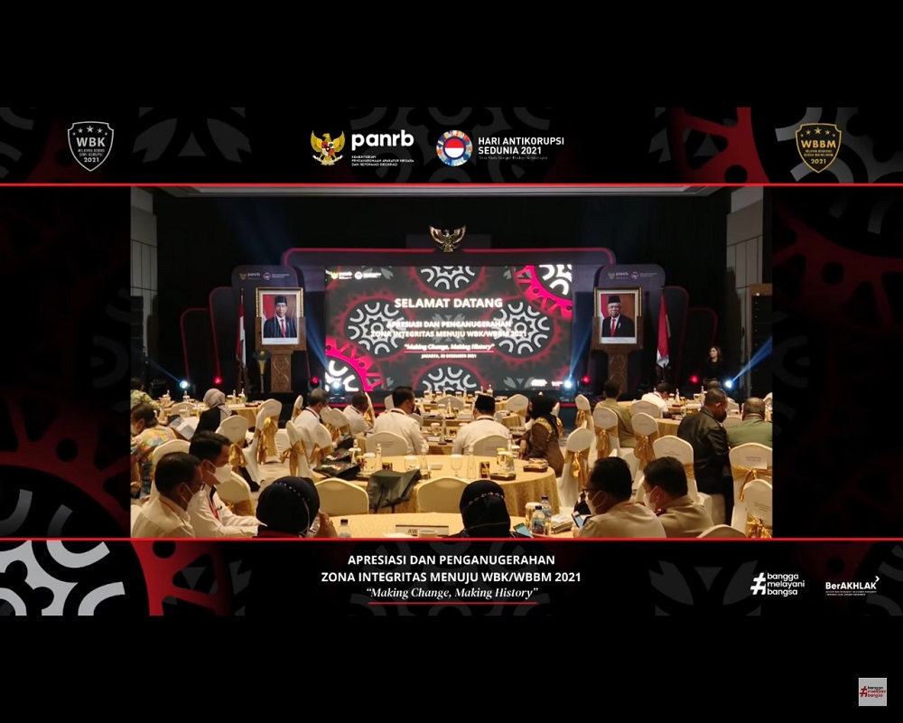Penganugerahan predikat Zona Integritas menuju Wilayah Bebas Korupsi (ZI-WBK) dan Wilayah Birokrasi Bersih Melayani (ZI-WBBM) kembali digelar oleh Kementerian Pendayagunaan Aparatur Negara dan Reformasi Birokrasi (Kemenpan-RB). Acara ini dilangsungkan dengan perpaduan metode tatap muka (offline) di Jakarta dan daring (online) di tempat kedudukan para pimpinan unit kerja masing-masing (Senin, 20/12).