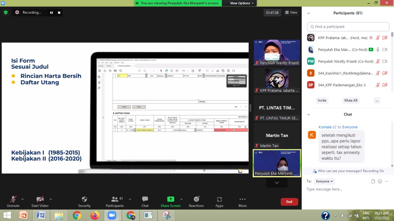 Pemaparan materi PPS disampaikan penyuluh KPP Pratama Jakarta Pademangan. Materi yang disampaikan terkait materi tentang siapa saja wajib pajak yang dapat mengikuti PPS, syarat dan ketentuannya, manfaat mengikuti program PPS, cara penghitungannya hingga tata cara penyampaian Surat Pemberitahuan Pengungkapan Harta (SPPH).