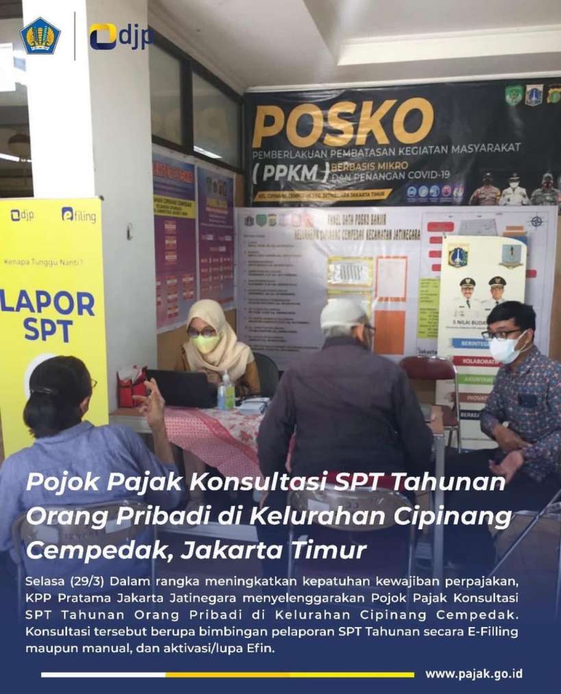 Kantor Pelayanan Pajak (KPP) Pratama Jakarta Jatinegara mengadakan Pojok Pajak Konsultasi SPT Tahunan Orang Pribadi, bertempat di Kelurahan Cipinang Cempedak, Jakarta Timur (Selasa, 29/3). Dalam rangka meningkatkan kepatuhan perpajakan, acara Pojok Pajak dilaksanakan untuk memberikan konsultasi berupa bimbingan pelaporan SPT Tahunan secara e-Filling maupun manual, aktivasi EFIN, lupa EFIN dan konsultasi terkait perpajakan lainnya.