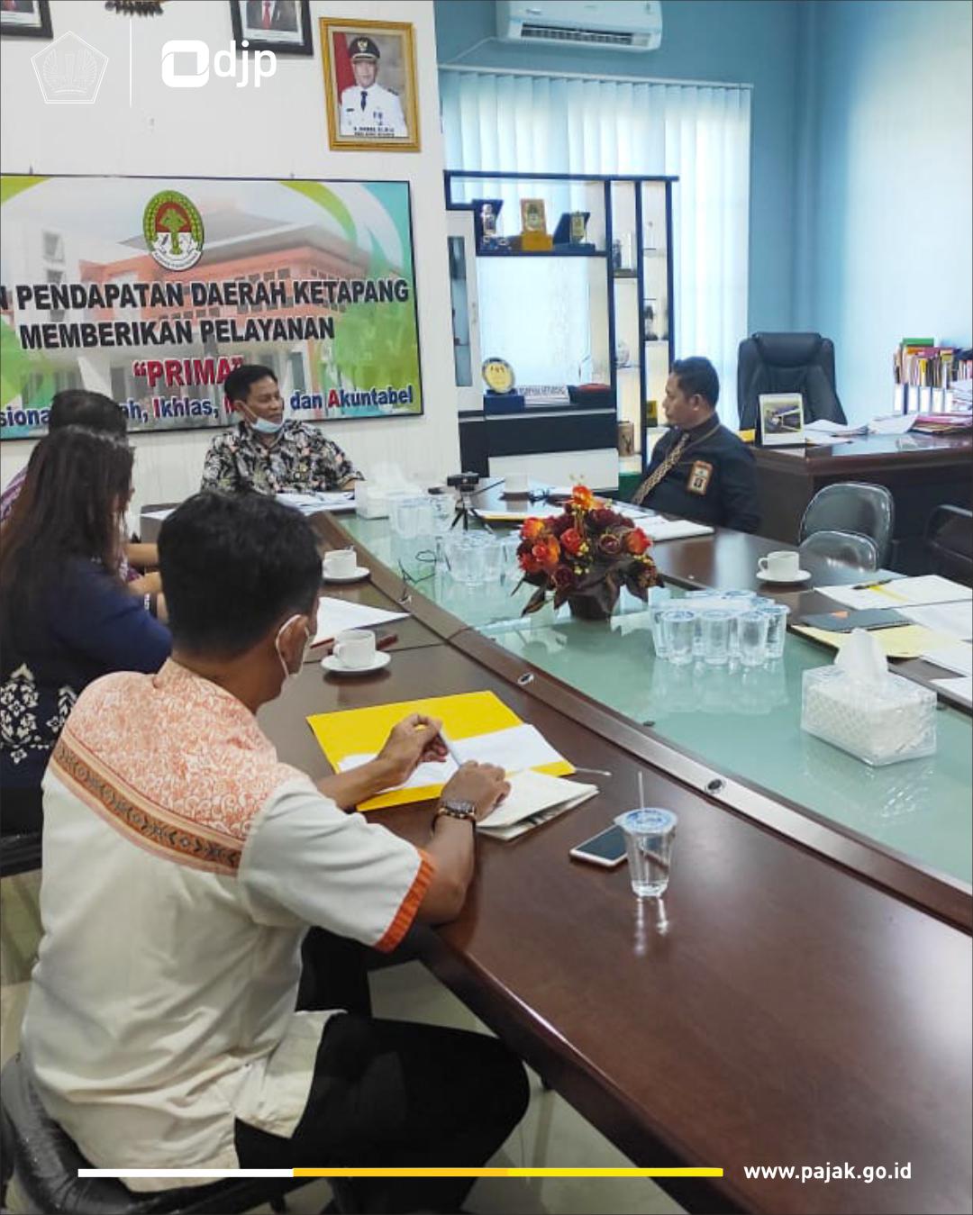 Kepala Kantor Pelayanan Pajak (KPP) Pratama Ketapang bersama tim mengunjungi Badan Pendapatan Daerah (BPD) Kabupaten Ketapang dalam rangka menindaklanjuti Perjanjian Kerja Sama pertukaran data dalam rangka optimalisasi pemungutan Pajak Pusat dan Pajak Daerah (Kamis, 16/9) .
