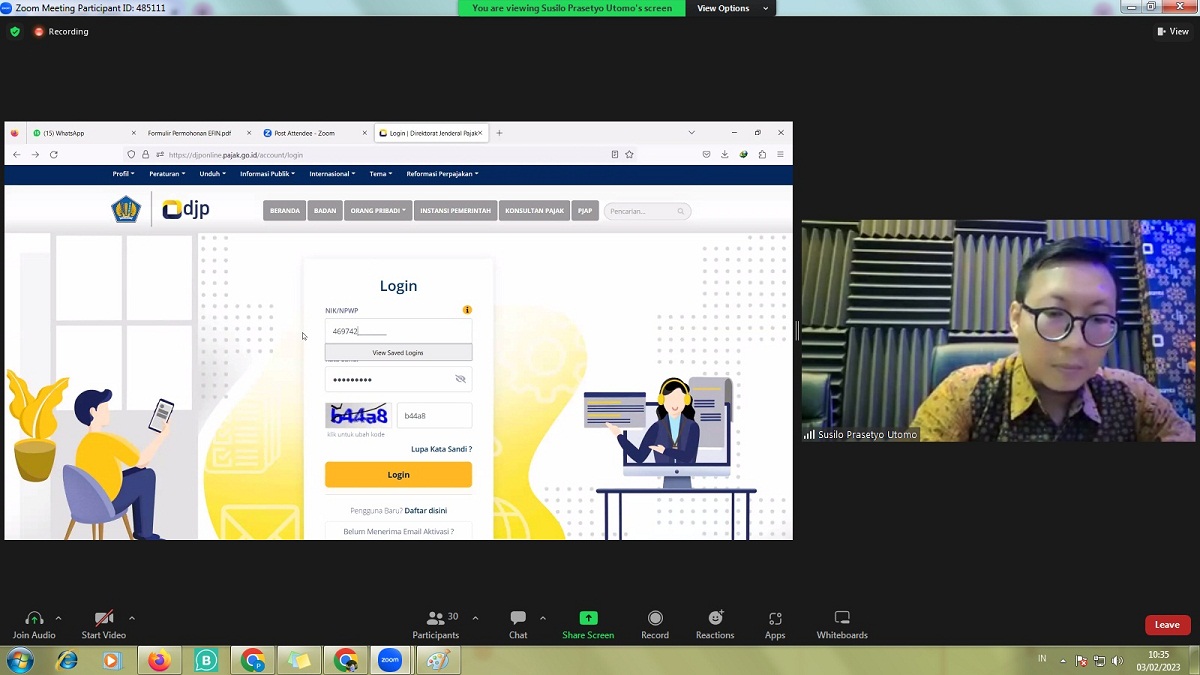Kelas pajak dilaksanakan secara daring melalui aplikasi Zoom Meeting dan berlangsung mulai pukul 09.00 WIB. Kegiatan ini dipandu oleh Tim Penyuluh Pajak KPP Pratama Kosambi Susilo Prasetyo Utomo dan Moch. Mipta Hudin. Selain penyampaian materi tentang kewajiban pelaporan SPT Tahunan, tim penyuluh juga membuka sesi diskusi dan tanya jawab dengan peserta kegiatan.