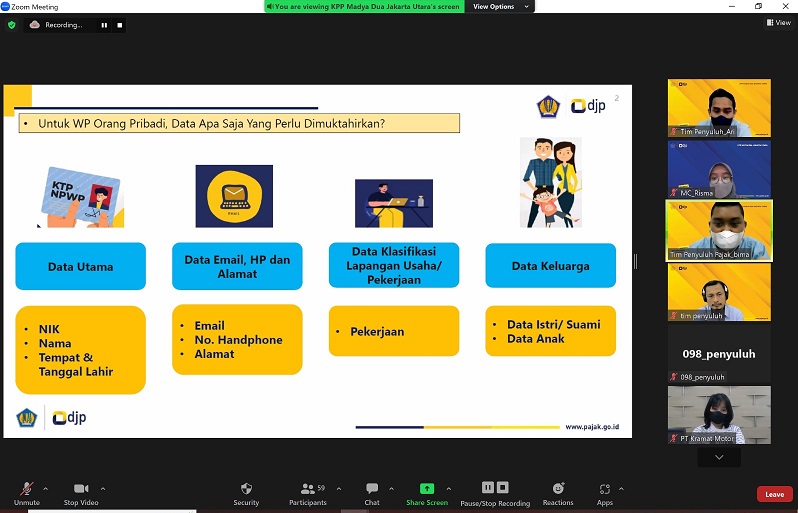 Kantor Pelayanan Pajak (KPP) Madya Dua Jakarta Utara mengadakan sosialisasi secara daring melalui Zoom Meeting terkait Surat Pemberitahuan (SPT) Tahunan Orang Pribadi dan implementasi Nomor Induk Kependudukan (NIK) menjadi Nomor Pokok Wajib Pajak (NPWP) di Jakarta (Rabu,15/2). Sosialisasi dihadiri 59 peserta mulai pukul 10.00 sampai 12.00 WIB.