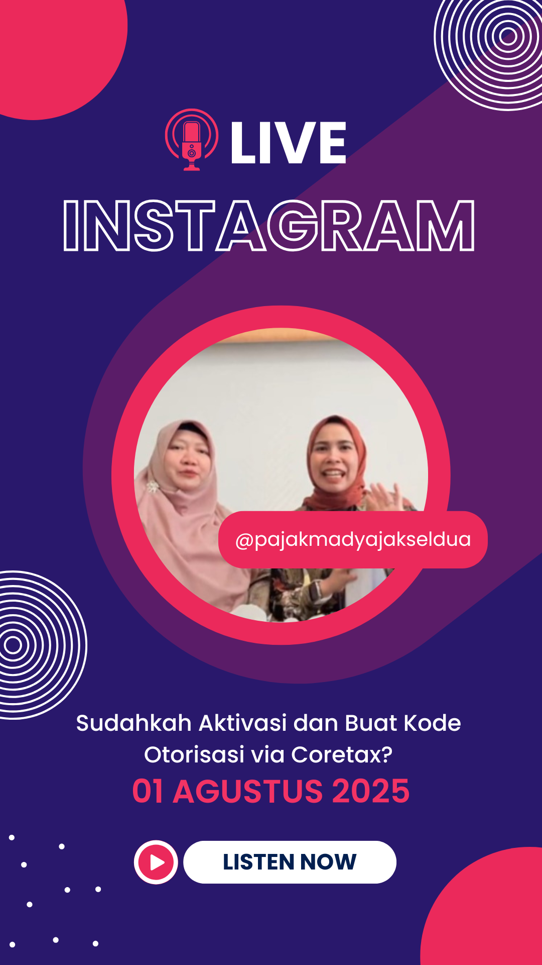 Siaran langsung edukasi perpajakan yang dikemas dalam Rujak Selada (Rumpi Pajak Madya Jaksel Dua) tersebut bertajuk “Sudahkah Aktivasi dan Buat Kode Otorisasi via Coretax?” berlangsung dari pukul 14.00 hingga 15.00 WIB. Narasumber pada live Instagram kali ini adalah Fungsional Penyuluh Pajak, Tri Aris Susanti dan Riana Anggita Sari.