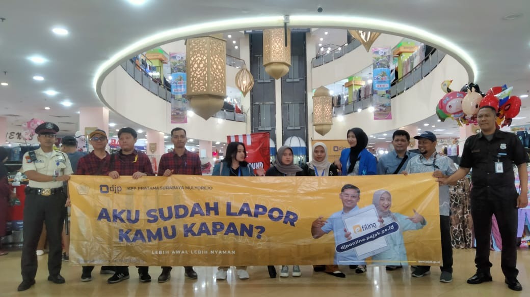 Kantor Pelayanan Pajak (KPP) Pratama Surabaya Mulyorejo mengadakan kampanye simpatik terkait pelaporan Surat Pemberitahuan (SPT) Tahunan 2024 sepanjang Bulan Februari sampai dengan 26 Februari 2025 di 10 titik persimpangan jalan dan pusat perbelanjaan grosir di wilayah Kecamatan Surabaya Utara dan Kecamatan Surabaya Timur, Kota Surabaya (Senin, 17/2).