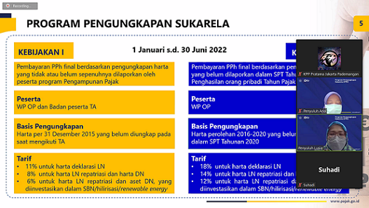 Kantor Pelayanan Pajak (KPP) Pratama Jakarta Pademangan mengadakan Kelas Pajak Program Pengungkapan Sukarela (PPS) di Jakarta (Rabu, 30/3). Kegiatan diselenggarakan melalui Zoom Meeting di ruang penyuluh KPP Pratama Jakarta Pademangan. Kelas pajak dihadiri 15 Wajib Pajak Orang Pribadi di wilayah KPP Pratama Jakarta Pademangan.