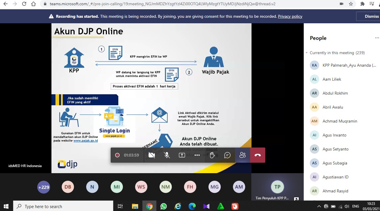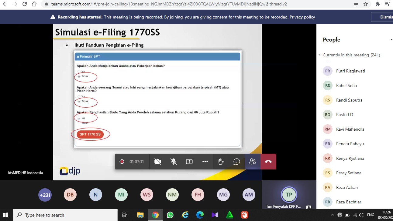 Kantor Pelayanan Pajak (KPP) Pratama Jakarta Palmerah melakukan Bimbingan Pengisian SPT Tahunan 1770S & 1770SS melalui Aplikasi Microsoft Teams kepada Karyawan IDS Medical Systems Indonesia (Rabu, 3/3).