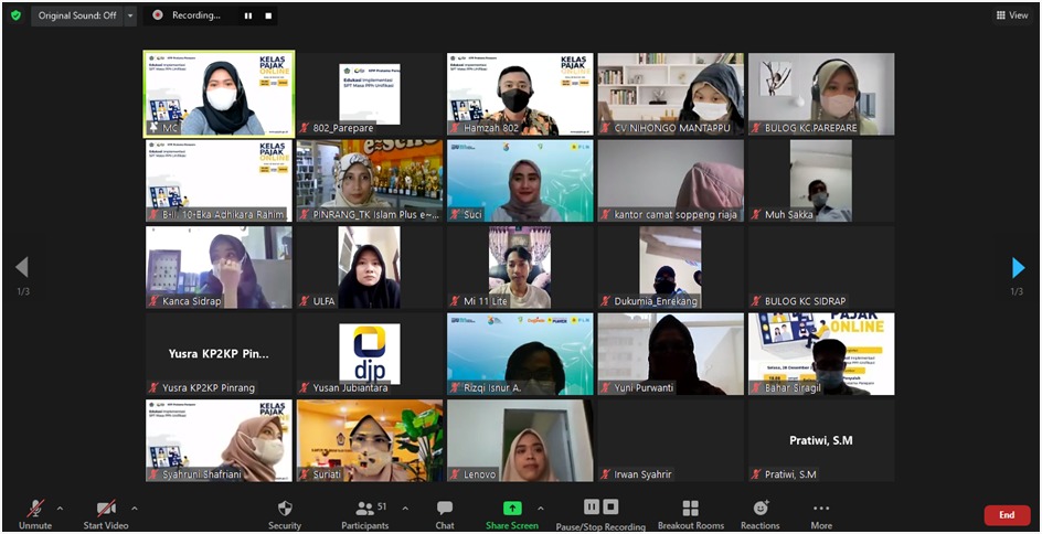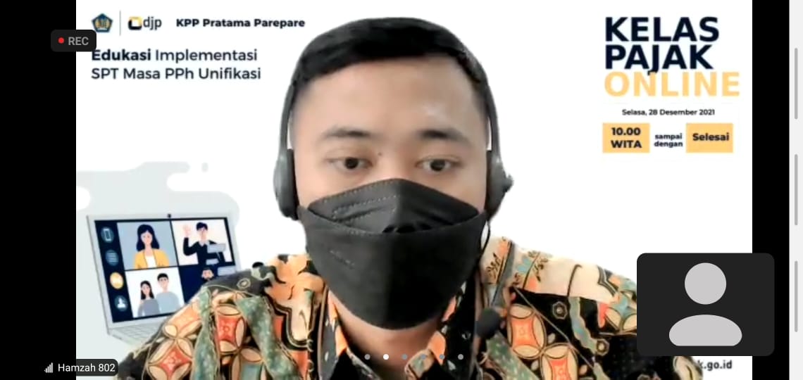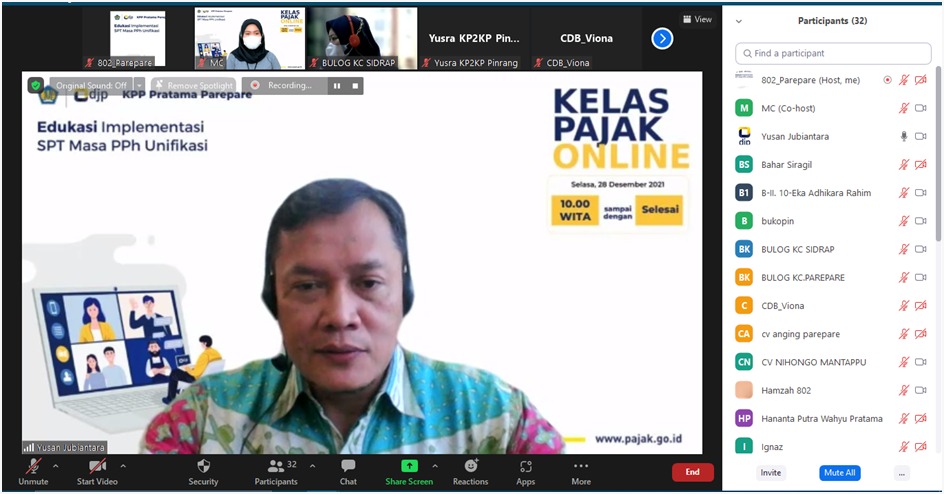 Kantor Pelayanan Pajak (KPP) Pratama Parepare menggelar kegiatan edukasi perpajakan dengan tema Edukasi Implementasi Surat Pemberitahuan (SPT) Masa PPh Unifikasi secara daring melalui Zoom Meeting dengan peserta Wajib Pajak Badan di Kota Parepare (Selasa, 28/12).