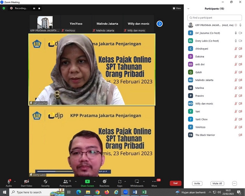 Kantor Pelayanan Pajak (KPP) Pratama Jakarta Penjaringan adakan kelas pajak tentang pelaporan SPT Tahunan PPh Orang Pribadi. Kelas pajak diikuti oleh 12 peserta dan diadakan secara daring di Jakarta (Kamis, 23/2).