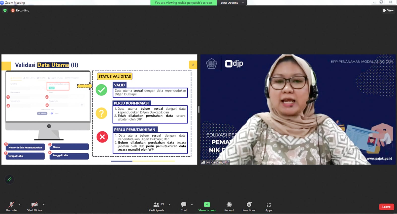 KPP Penanaman Modal Asing Dua melaksanakan kegiatan Kelas Pajak Pemadanan NIK dengan NPWP secara daring yang dipandu oleh Fungsional Penyuluh Pajak KPP Penanaman Modal Asing Dua, Jakarta (Selasa, 14/2). Kegiatan Kelas Pajak ini dilakukan dalam dua sesi, sesi pertama pada pukul 10.00 WIB dan sesi kedua pada pukul 14.00 WIB dengan jumlah peserta yang hadir sebanyak 32 peserta.