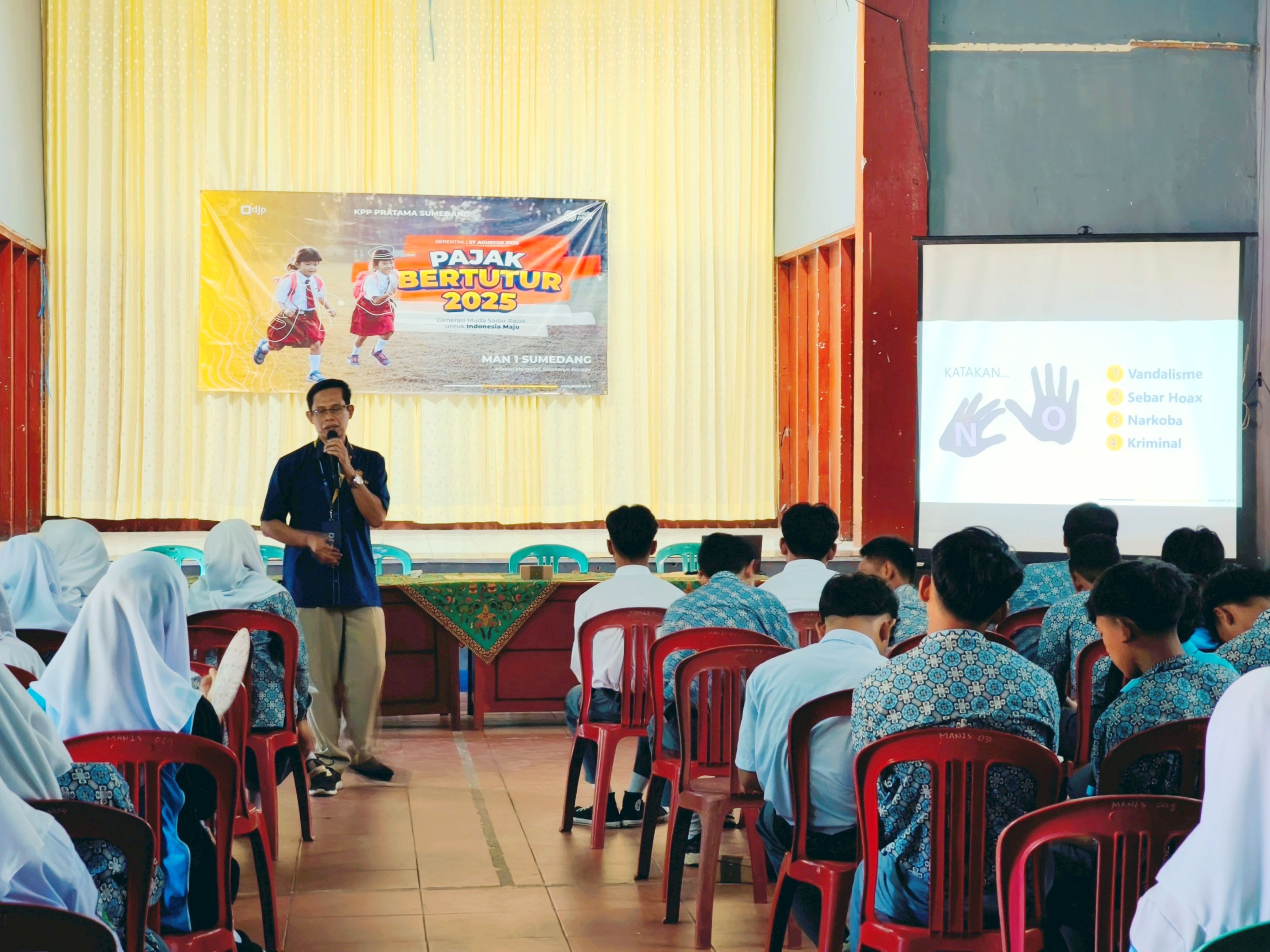 Kantor Pelayanan Pajak (KPP) Pratama Sumedang menyelenggarakan kegiatan Pajak Bertutur tahun 2025 di Madrasah Aliyah Negeri (MAN) 1 Sumedang yang diikuti puluhan siswa 80 siswa anggota OSIS dan MPK MAN 1 Sumedang, Sumedang (Rabu, 27/8).