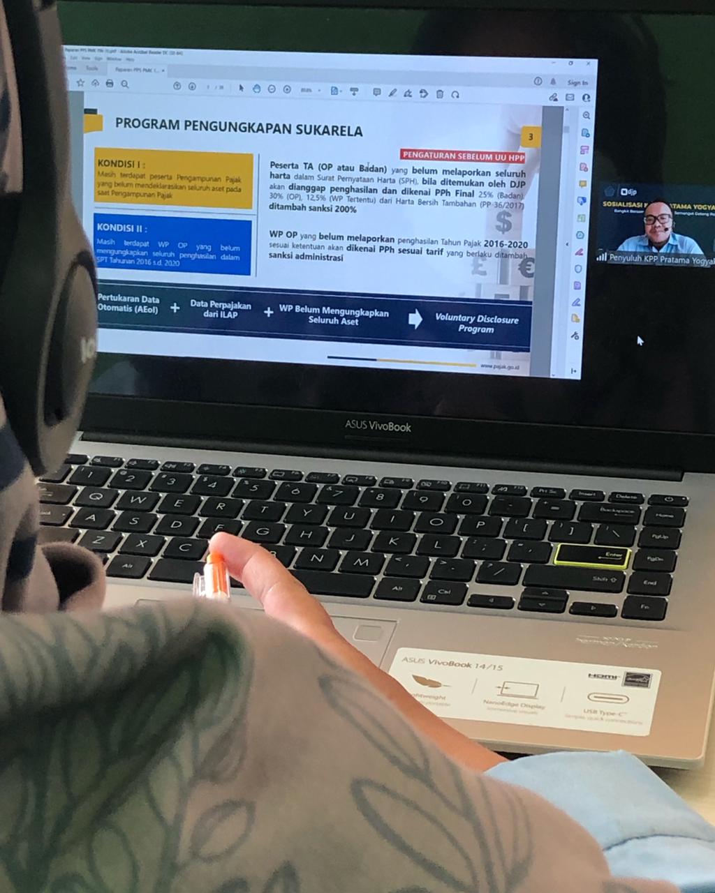 Kantor Pelayanan Pajak (KPP)  Pratama Yogyakarta yang diwakili oleh tim Fungsional Penyuluh Pajak Rudi Hendriawan dan Sri Hartini melakukan sosialisasi tentang Program Pengungkapan Sukarela (PPS) secara daring dari studio penyuluh lantai 2 KPP Pratama Yogyakarta (Kamis, 31/3).