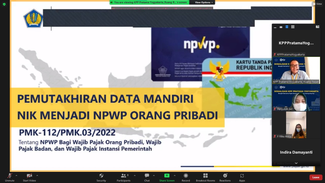 Sebagai strategi penyuksesan implementasi NIK sebagai NPWP, KPP Pratama Yogyakarta kembali menggelar sosialisasi daring bertajuk Pemutakhiran Data Mandiri dalam rangka Implementasi NIK menjadi NPWP Orang Pribadi (Rabu, 11/01).