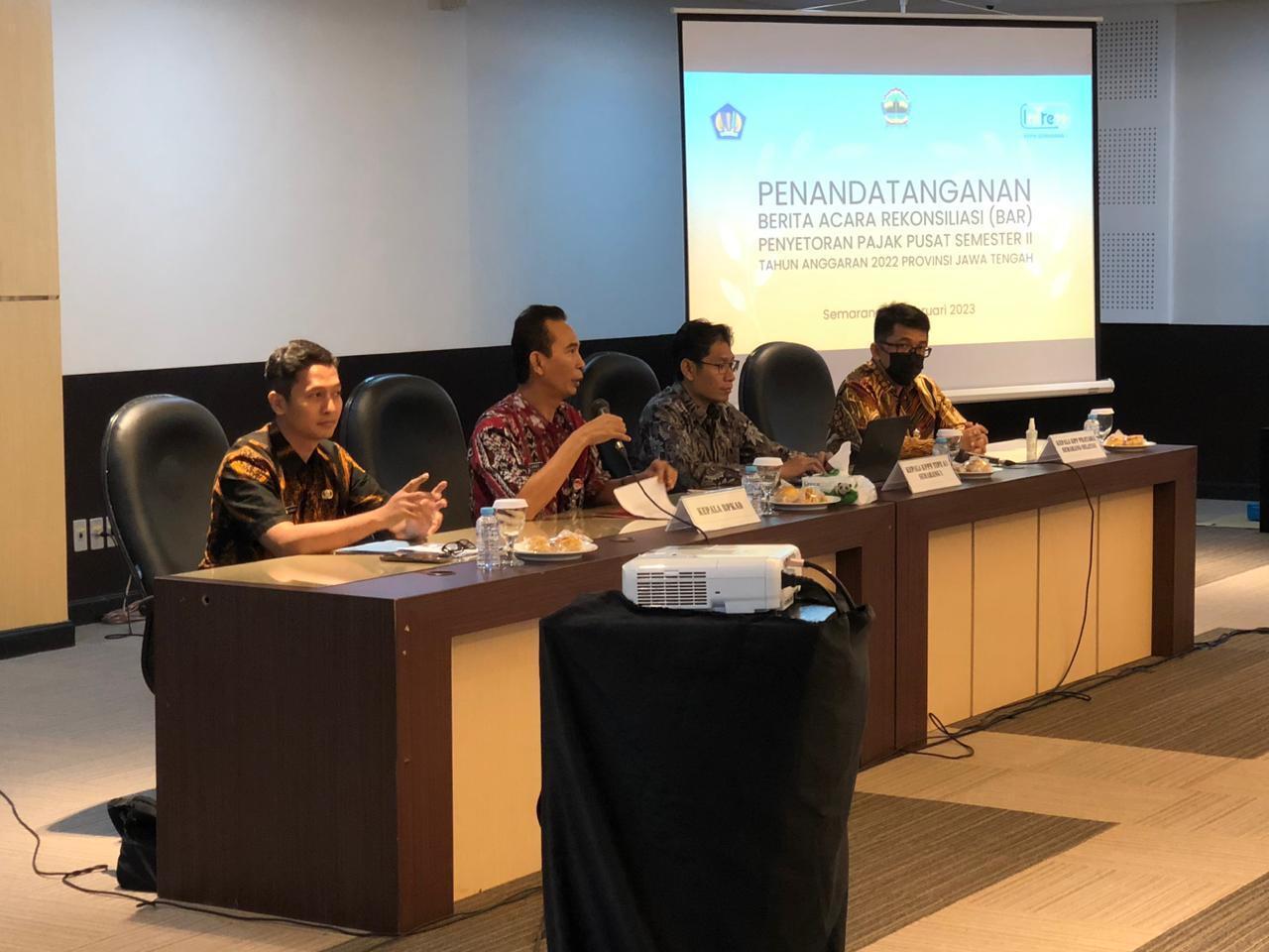 Kantor Pelayanan Pajak Pratama Semarang Selatan melakukan penandatanganan Berita Acara Rekonsiliasi Penandatanganan Berita Acara Rekonsiliasi (BAR) Penyetoran Pajak Pusat Semester II Tahun 2022 bersama dengan Badan Pengelolaan Keuangan dan Aset Daerah (BPKAD) Provinsi Jawa Tengah dan Kantor Pelayanan Perbendaharaan Negara (KPPN) Semarang I di Kota Semarang (Selasa, 21/02).