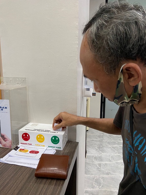 Petugas Tempat Pelayanan Terpadu (TPT) Kantor Pelayanan Pajak (KPP) Pratama Singkawang mengadakan survei kepuasan layanan untuk mengetahui tingkat kepuasan wajib pajak di KPP Pratama Singkawang (Rabu, 3/11). Wajib pajak yang telah selesai mendapatkan pelayanan perpajakan dari petugas TPT diarahkan untuk mengisi form survei kepuasan serta kritik dan saran atas pelayanan yang telah diberikan. Setelah itu, petugas TPT mengarahkan wajib pajak untuk memasukkan form yang telah diisi ke dalam kotak survei.