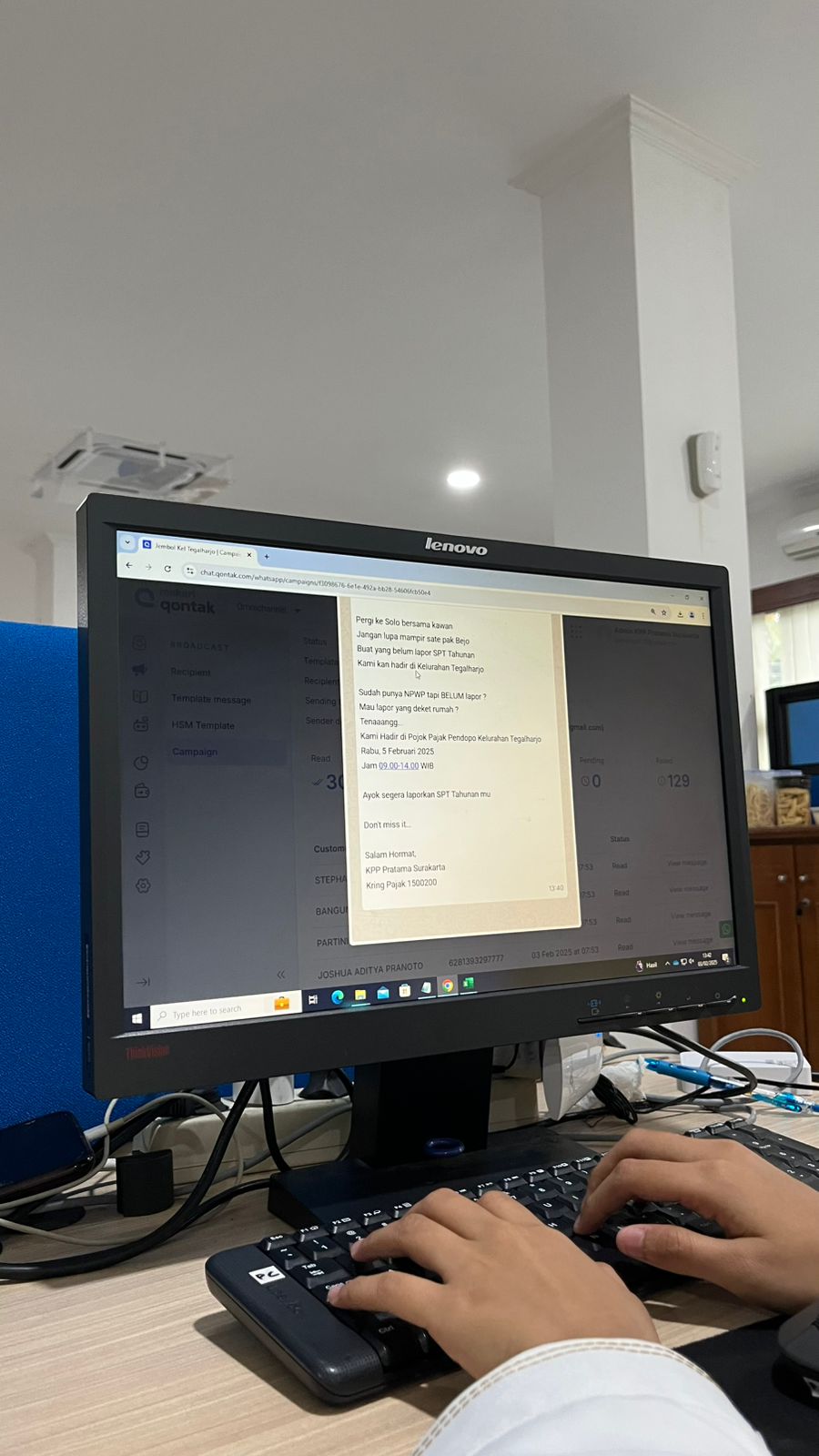 Kantor Pelayanan Pajak (KPP) Pratama Surakarta telah mengirimkan pesan WhatsApp Blast kepada wajib pajak yang berdomisili di wilayah Kelurahan Mojo, Kelurahan Joyosuran, Kelurahan Semanggi, dan Kelurahan Pasar Kliwon, Kota Surakarta (Jumat, 31/1).