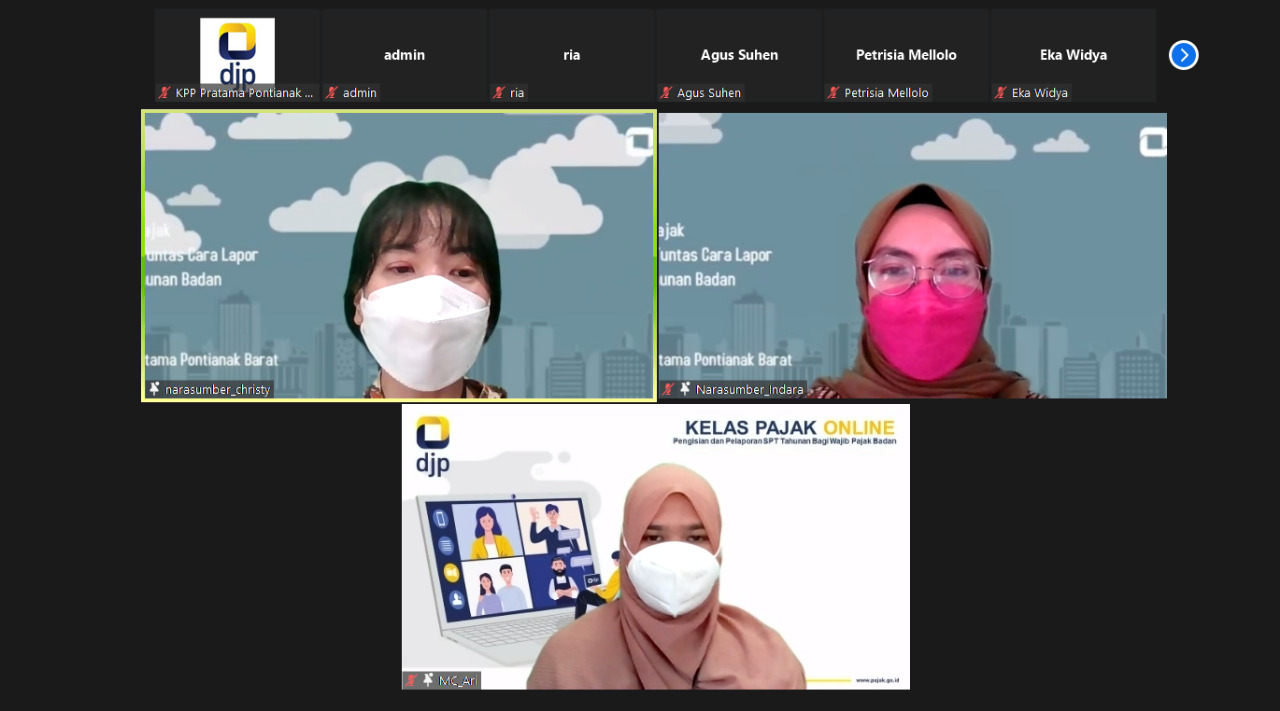 antor Pelayanan Pajak (KPP) Pratama Pontianak Barat kembali mengadakan kelas pajak “Kupas Tuntas Cara Lapor SPT Tahunan Badan secara daring, Pontianak (Jumat, 29/10). Kelas pajak ini diadakan guna meningkatkan keterampilan perpajakan dalam hal SPT Tahunan Badan. Indaraputuri Nurmasruri Penyuluh Pajak mengimbau peserta yang sudah mempunyai kewajiban lapor untuk segera lapor SPT Tahunan walaupun sudah lewat jatuh tempo.