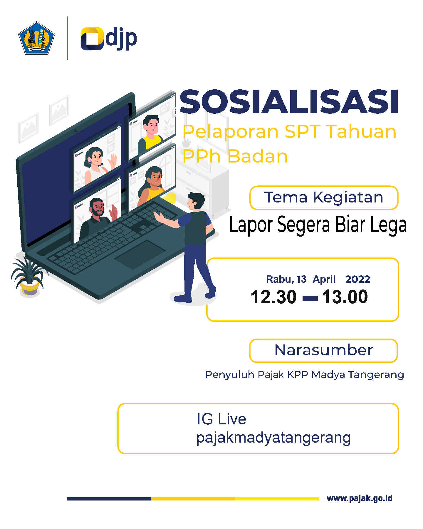 Pada live IG tersebut, Tim Penyuluh KPP Madya Tangerang memberikan penjelasan terkait pelaporan SPT Tahunan Badan yang akan berakhir pada tanggal 30 April 2022. Tim Penyuluh juga mengajak Wajib Pajak untuk segera melaporkan SPT Tahunan Badan. Dengan adanya live IG ini, Tim Penyuluh KPP Madya Tangerang berharap Wajib Pajak semakin sadar akan kewajibannya untuk tepat waktu melaporkan SPT Tahunan Badan,