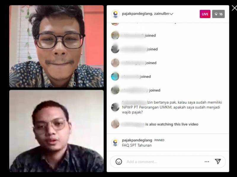 Kegiatan bincang-bincang melalui Instagram Live ini adalah salah satu bentuk komitmen KPP Pratama Pandeglang untuk terus memberikan pelayanan prima kepada WP. Dengan memfasilitasi ruang untuk memberikan jawaban atas pertanyaan seputar pelaporan SPT Tahunan, Kami berharap kegiatan dapat meningkatkan kepatuhan SPT Tahunan di wilayah Pandeglang tahun ini," ujar Gilang.