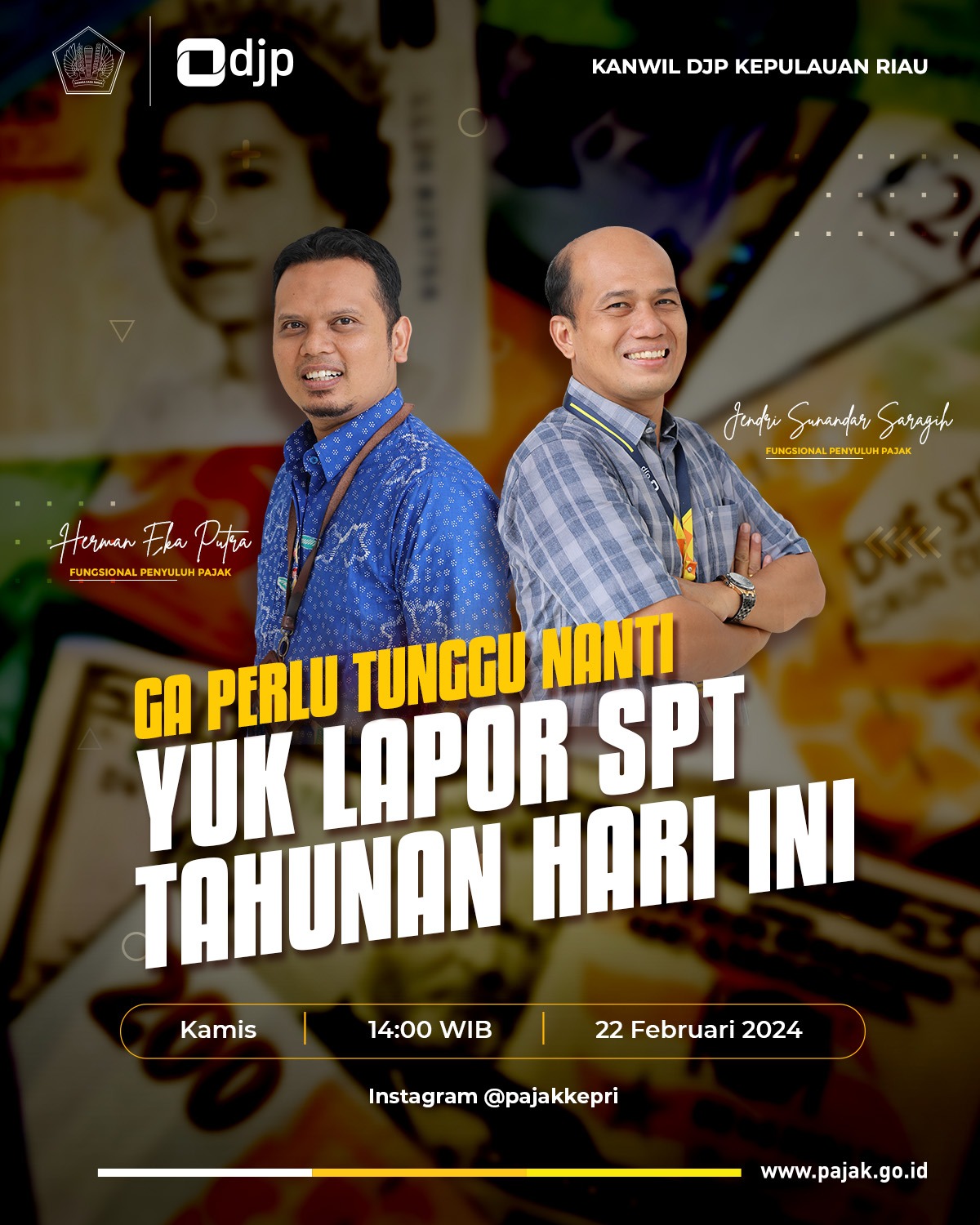 Kantor Wilayah Direktorat Jenderal Pajak Kepulauan Riau (Kanwil DJP Kepri) mensosialisasikan “Pelaporan Surat Pemberitahuan (SPT) Tahunan Wajib Pajak Orang Pribadi” melalui siaran langsung (live) Instagram dengan akun @pajakkepri dari Kota Batam, Kepri (Kamis, 22/2). Fungsional Penyuluh Pajak Jendri Sunandar Saragih dan Herman Eka Putra menjadi narasumber pada acara ini.