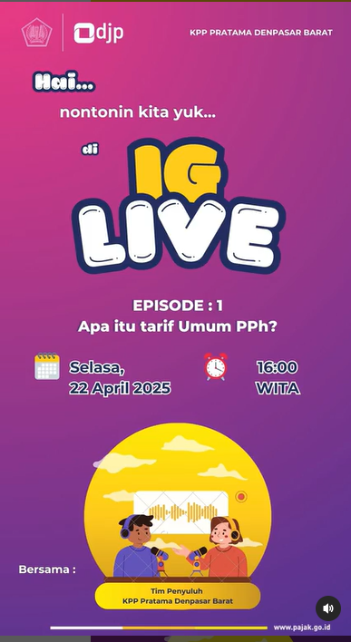 Kantor Pelayanan Pajak (KPP) Pratama Denpasar Barat kembali menggelar siniar bertajuk “Apa itu tarif umum PPh?” yang tayang secara langsung di akun Instagram @pajakdenbar bertempat di Ruang Podcast KPP Denpasar Barat, Kota Denpasar (Selasa, 22/4).