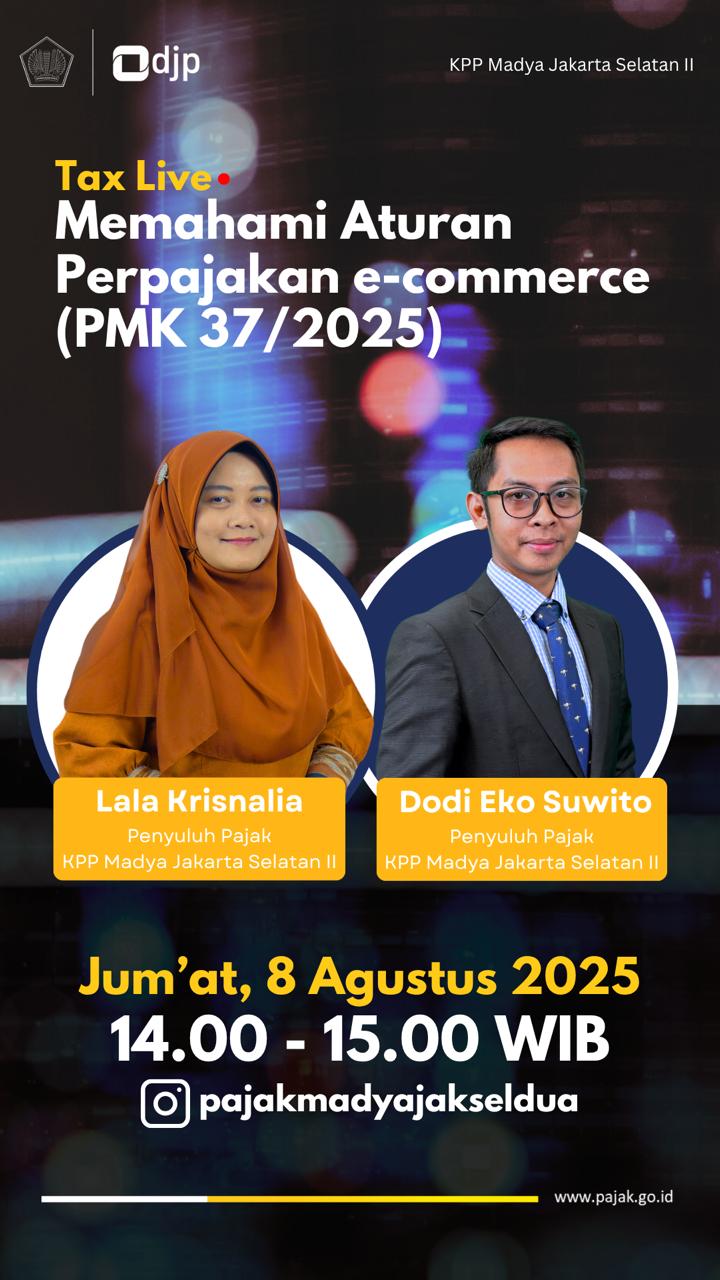 Siaran langsung edukasi perpajakan yang dikemas dalam Rujak Selada (Rumpi Pajak Madya Jaksel Dua) tersebut bertajuk “Memahami Aturan Perpajakan e-commerce PMK 37/2025” berlangsung dari pukul 14.00 hingga 15.00 WIB. Narasumber pada live Instagram (IG) kali ini adalah Fungsional Penyuluh Pajak KPP Madya Jakarta Selatan II, Lala Krisnalia dan Dodi Eko Suwito.