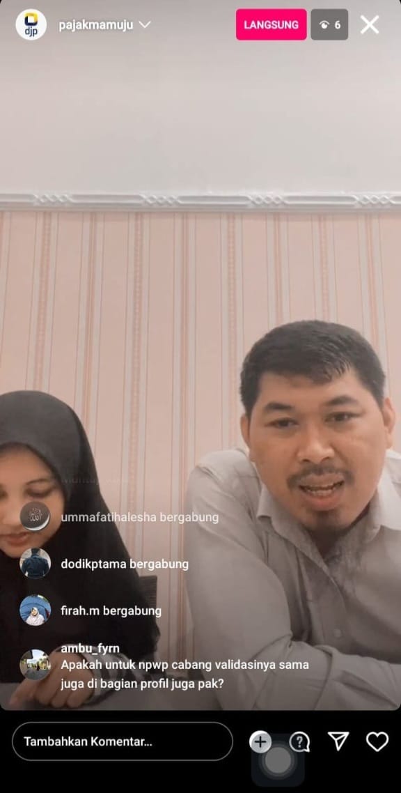 Live Instagram dipandu oleh Pelaksana Seksi Pelayanan Siti Ridha Amelia sebagai moderator dan Asisten Penyuluh Pajak Mahir Sulistiyo sebagai narasumber. Selama berlangsungnya Instagram Live ini, Sulistyo juga menyampaikan mengenai format baru NPWP, di mana NIK akan digunakan sebagai pengganti NPWP bagi Wajib Pajak Orang Pribadi, NPWP 16 digit angka bagi selain Wajib Pajak Orang Pribadi, dan Nomor Identitas Tempat Kegiatan Usaha Bagi Wajib Pajak Cabang.