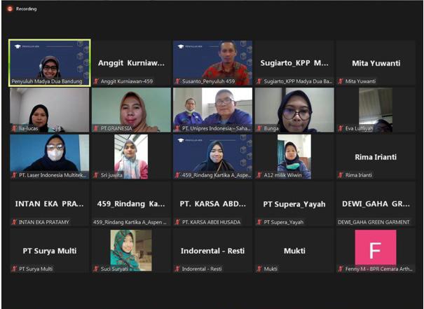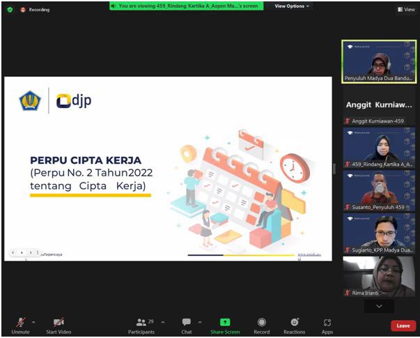 Kantor Pelayanan Pajak (KPP) Madya Dua Bandung memberikan edukasi wajib pajak terkait Peraturan Pemerintah Pengganti Undang-Undang (Perpu) Nomor 2 Tahun 2022 tentang Cipta Kerja “Kluster Perpajakan” melalui Zoom Meeting di Jalan Ibrahim Adjie No.372, Kota Bandung (Selasa, 31/1).