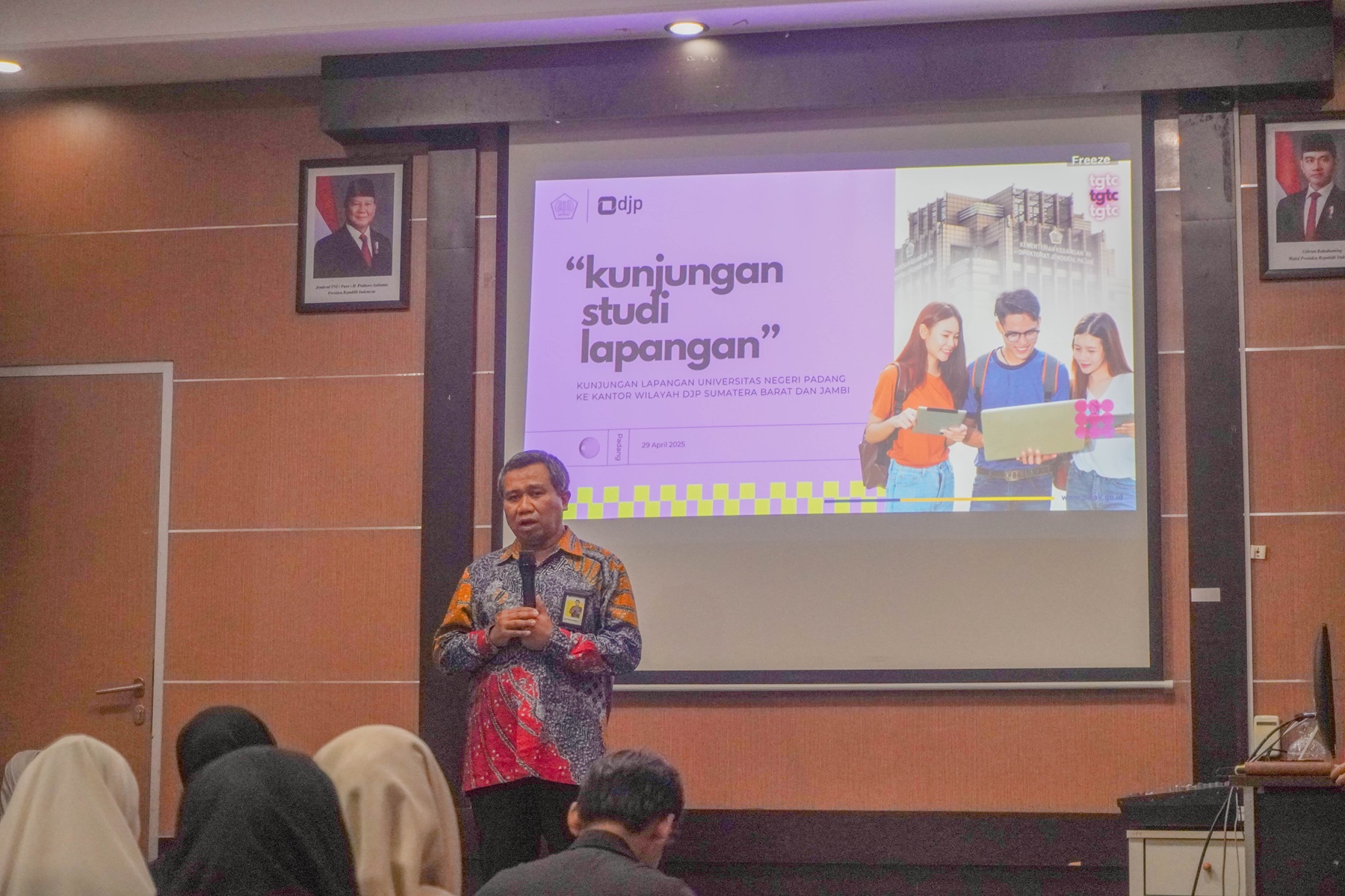 Mahasiswa Program Studi Akuntansi, Fakultas Ekonomi dan Bisnis, Universitas Negeri Padang (UNP), melaksanakan kegiatan Studi Lapangan untuk Mata Kuliah Perencanaan Pajak ke Kantor Wilayah Direktorat Jenderal Pajak (DJP) Sumatera Barat dan Jambi di Kota Padang (Selasa, 29/4). Kegiatan ini merupakan bagian dari upaya akademik untuk memberikan pemahaman langsung kepada mahasiswa mengenai praktik administrasi perpajakan di Indonesia.