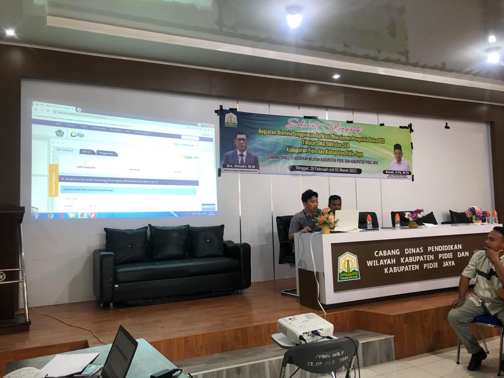 Kegiatan ini merupakan bagian dari acara kegiatan yang berjudul Bimtek Penggunaan Aplikasi Manajemen Pengelola Dana BOS Tingkat SMA, SMK, dan SLB Kabupaten Pidie dan Pidie Jaya yang diselenggarakan oleh Cabang Dinas Pendidikan Provinsi Aceh Wilayah Kabupaten Pidie dan Kabupaten Pidie Jaya.