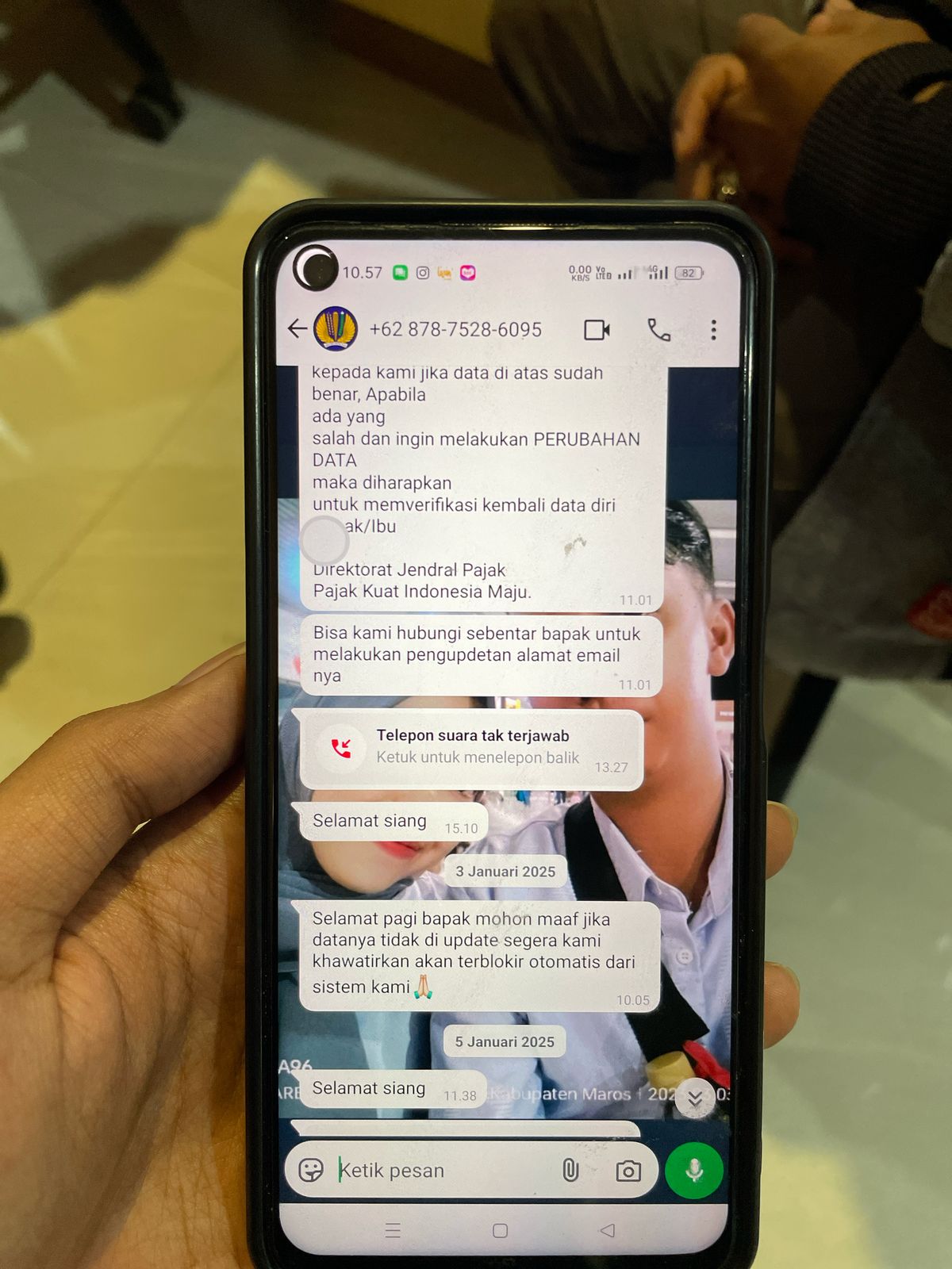 “Saya mendapat pesan Whatsapp dari oknum yang mengaku dari kantor pajak, saya dimintai data pribadi untuk memperbarui data perpajakan saya,” ujar wajib pajak tersebut.