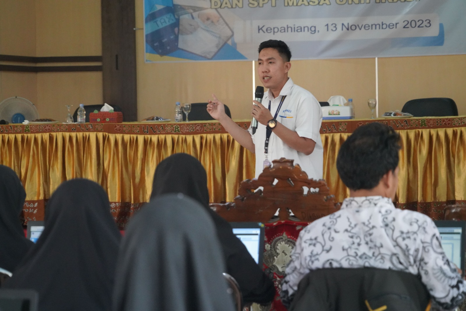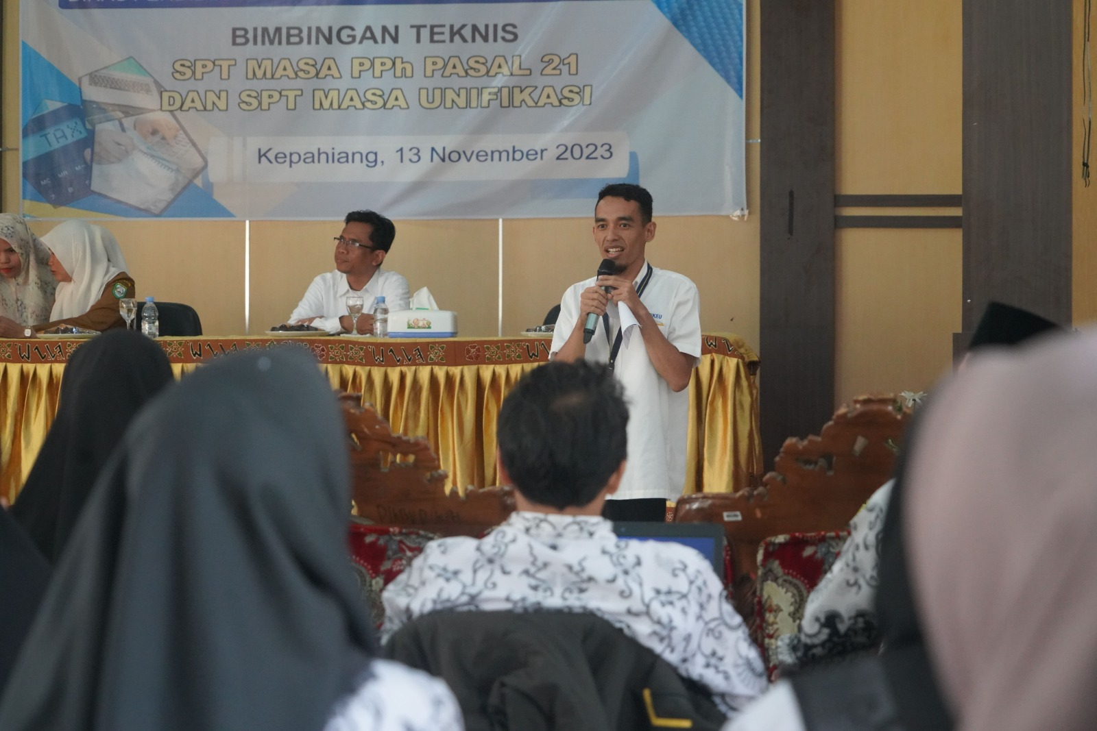 Kantor Pelayanan Pajak (KPP) Pratama Curup dan Kantor Pelayanan, Penyuluhan, dan Konsultasi Perpajakan (KP2KP) Kepahiang melaksanakan Bimbingan Teknis (Bimtek) Surat Pemberitahuan (SPT) Masa Unifikasi bagi Sub Unit Instansi Pemerintah yang bertempat di Gedung Serbaguna Dinas Pendidikan dan Kebudayaan Kabupaten Kepahiang, Provinsi Bengkulu (Senin, 13/11). Peserta bimtek kali ini merupakan perwakilan Sekolah Dasar (SD) yang berada di Kabupaten Kepahiang.