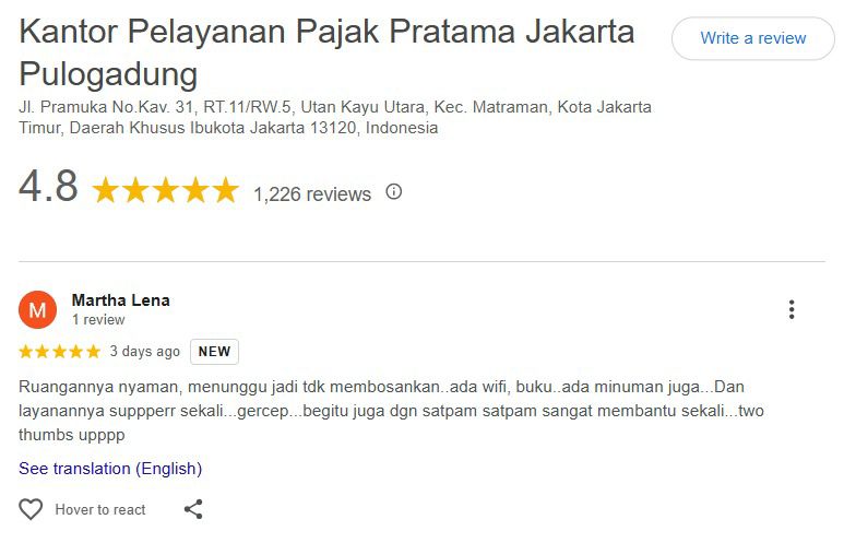 Kantor Pelayanan Pajak (KPP) Pratama Jakarta Pulogadung terus menunjukkan komitmennya dalam memberikan pelayanan terbaik kepada wajib pajak. Kualitas layanan KPP Pratama Jakarta Pulogadung tercermin dari ulasan masyarakat di Google Review. Hingga saat ini, KPP Pratama Jakarta Pulogadung mendapatkan penilaian 4,8 dari 5 bintang dengan total 1.266 ulasan.