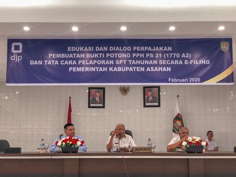KPP Pratama Kisaran bekerja sama dengan Pemerintah Kabupaten Asahan menyelenggarakan kegiatan Edukasi dan Dialog Perpajakan terkait Pembuatan Bukti Potong PPh Pasal 21 (1770-A2) dan Tata Cara Pelaporan SPT Tahunan secara e-Filing di Aula Kantor Bupati Asahan (Rabu, 5/2). Kegiatan yang dibuka oleh Bupati Asahan, H. Surya ini dihadiri oleh Kepala KPP Pratama Kisaran, Anto Sibarani, serta Kepala dan Bendahara Organisasi Perangkat Daerah (OPD) yang meliputi Sekretariat Daerah, Dinas Daerah, Lembaga Teknis Daerah, dan Kecamatan di lingkungan Kabupaten Asahan.
