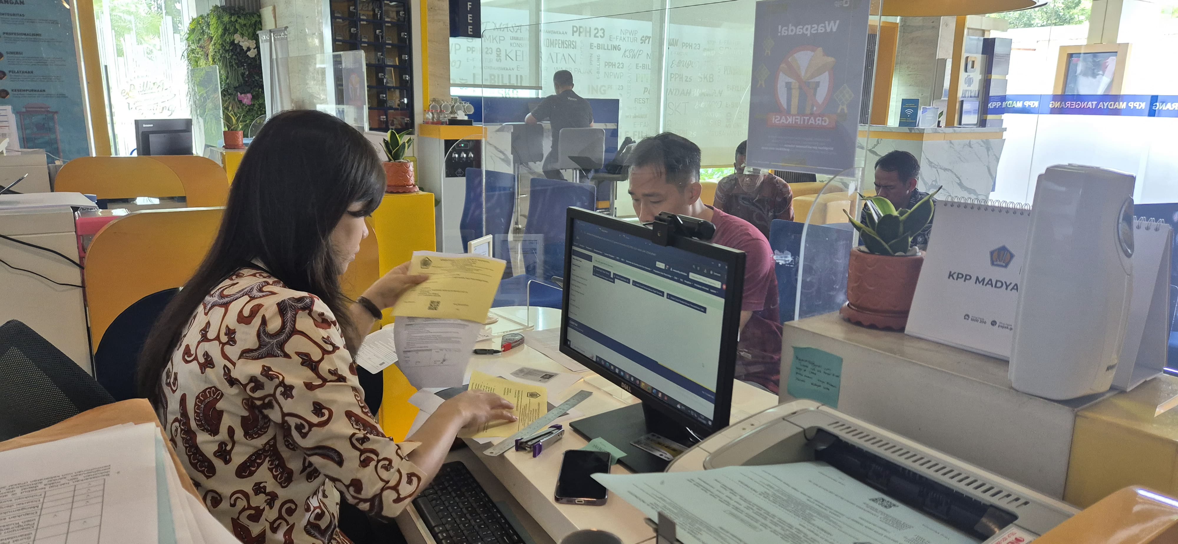 Rani, Petugas Tempat Pelayanan Terpadu (TPT) memberikan pelayanan kepada Wajib Pajak Orang Pribadi yang datang ke loket TPT Kantor Pelayanan Pajak Madya Tangerang, Jalan Jalur Sutera Barat No.3, RT 003/RW 006, Pananggungan Timur, Pinang, Kota Tangerang, Banten (Jumat, 31/1).