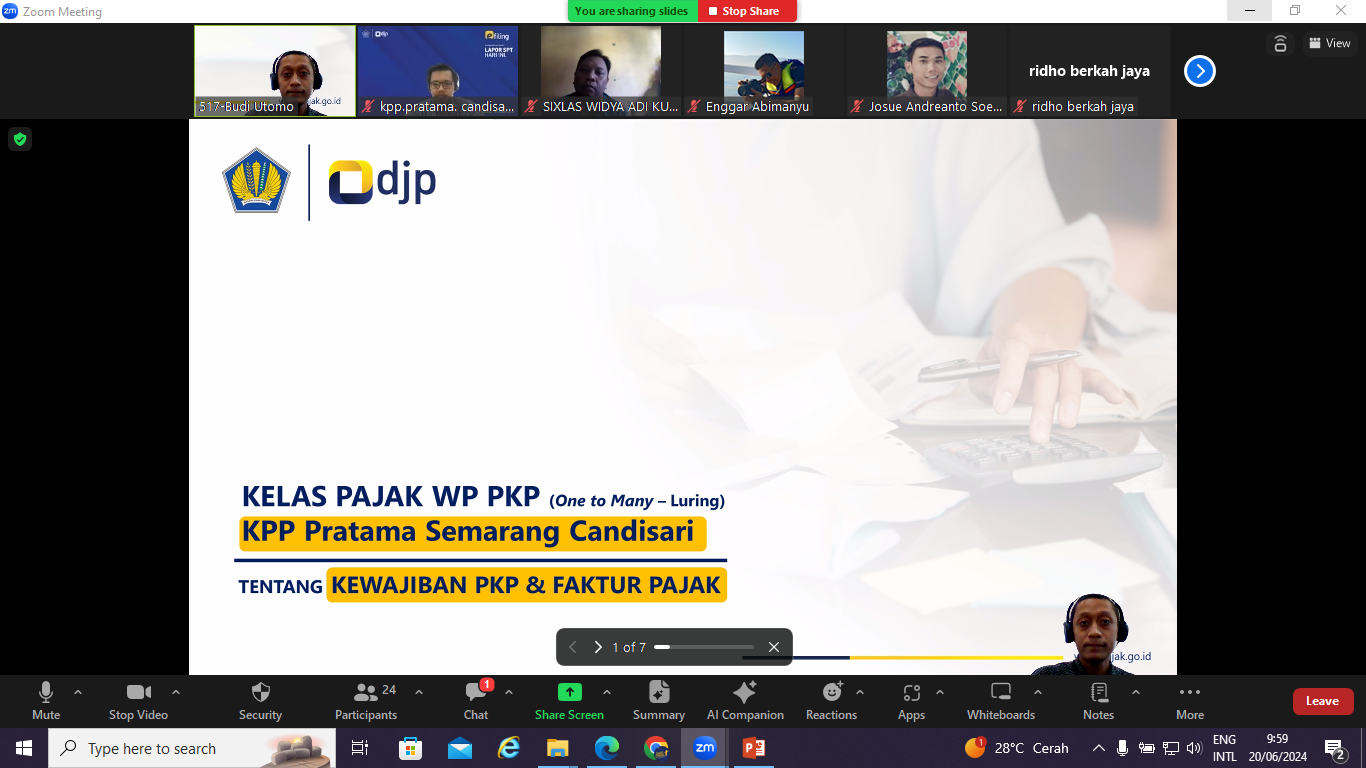 Kantor Pajak Pelayanan (KPP) Pratama Semarang Candisari menggelar kelas pajak daring khususnya bagi Wajib Pajak (WP) Pengusaha Kena Pajak (PKP), membahas kewajiban perpajakan PKP yang disampaikan langsung oleh penyuluh pajak di Zoom meeting KPP Pratama Semarang Candisari pukul 09.00 WIB hingga selesai (Kamis, 20/06).