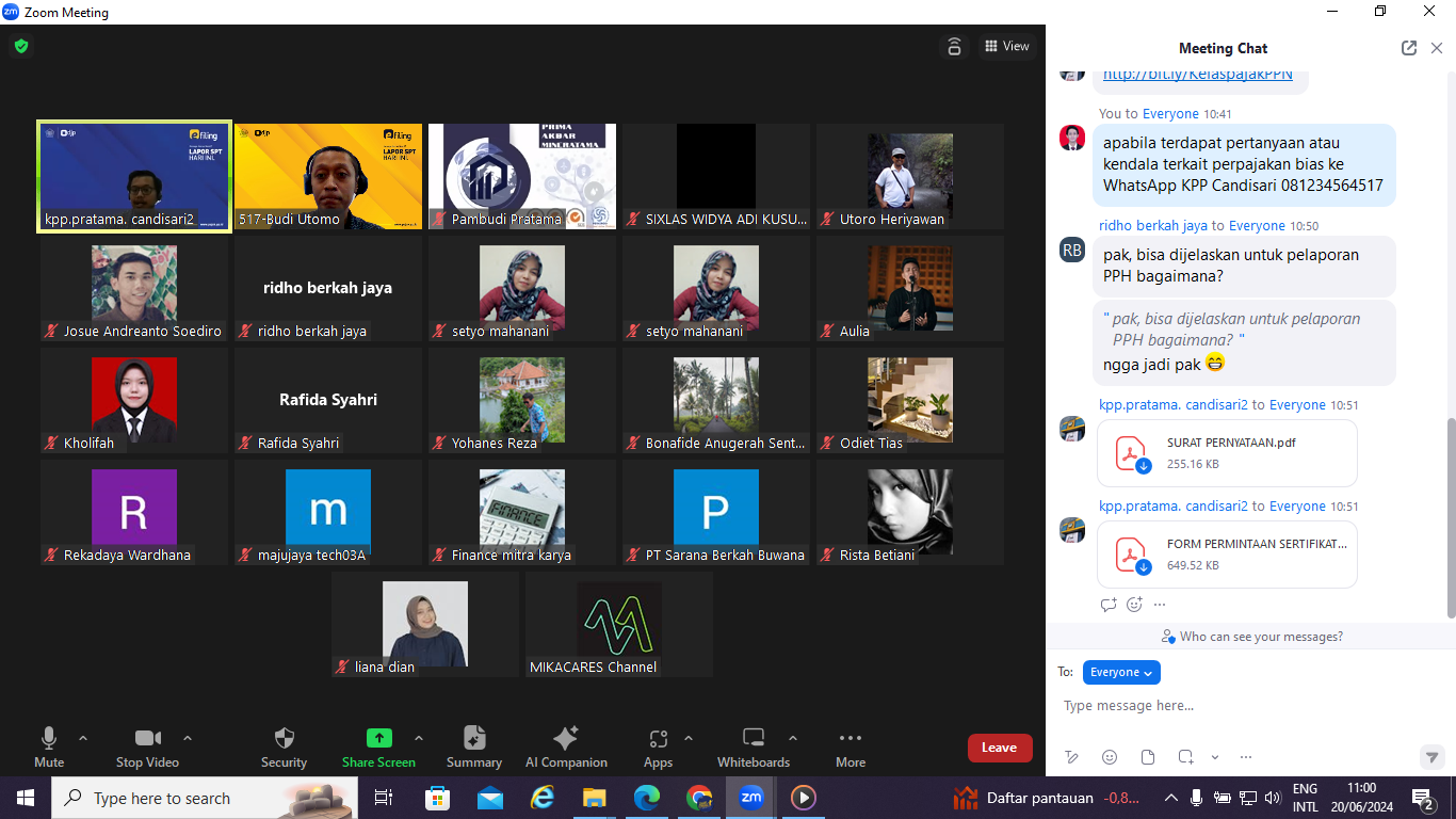 Setelah materi kewajiban perpajakan PKP diberikan dari Faktur Pajak, e-Faktur Desktop hingga pelaporan SPT masa PPN, dibuka juga sesi diskusi kepada peserta kelas pajak PKP. Sebanyak 20 peserta kelas pajak daring cukup antusias aktif bertanya sehingga dapat meningkatkan pengetahuan dan pemahaman perpajakannya. Jika masih terdapat kendala atau pertanyaan dapat menghubungi Kring Pajak 1500 200 atau menghubungi KPP terdaftar. Kegiatan berjalan baik dan lancar serta ditutup pukul 11.30 siang.