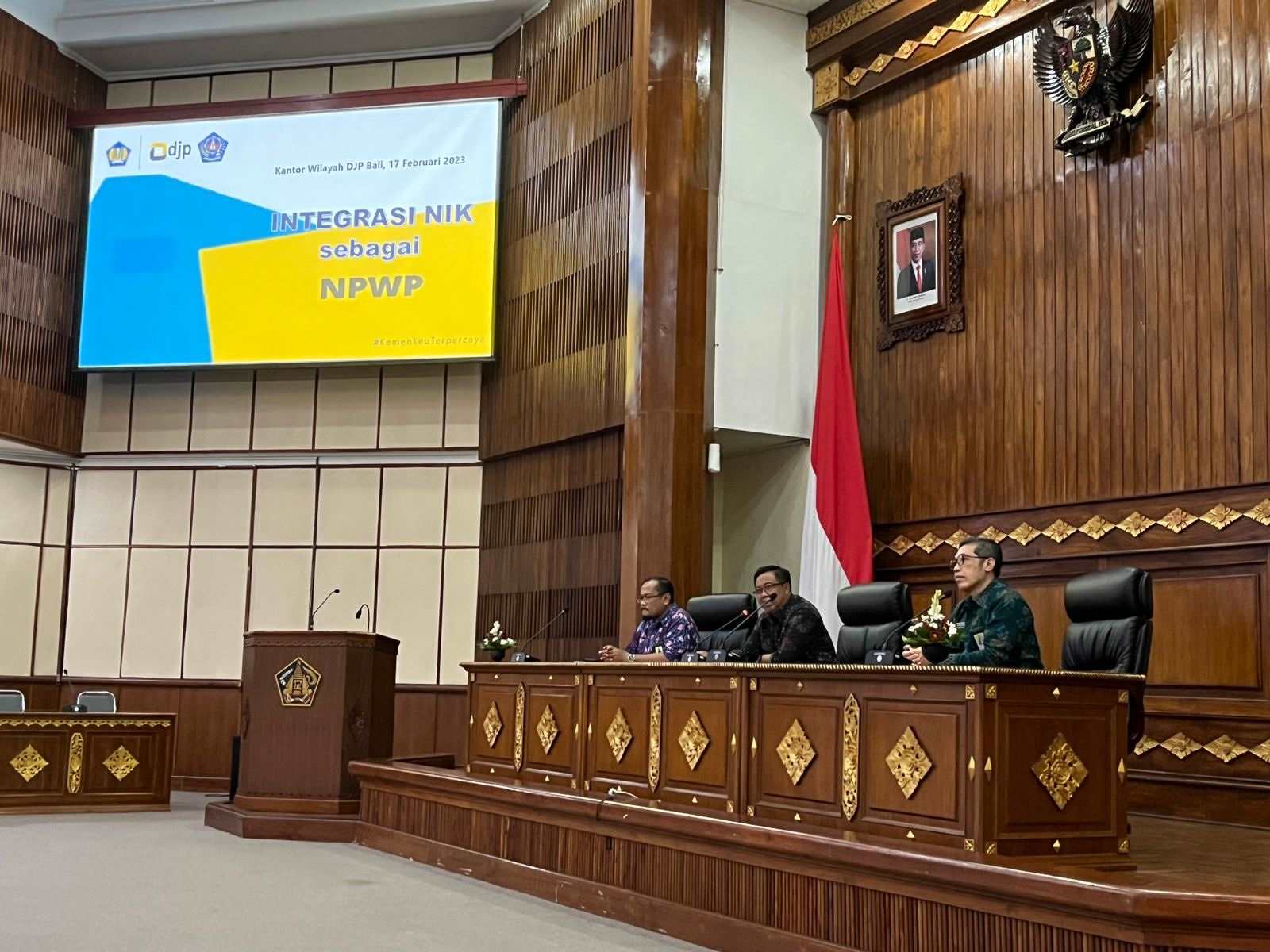 Kantor Wilayah Direktorat Jenderal Pajak (Kanwil DJP) Bali bekerja sama dengan Kantor Pelayanan Pajak (KPP) Pratama Denpasar Timur dan KPP Pratama Denpasar Barat melaksanakan kegiatan sosialisasi pelaporan Surat Pemberitahuan (SPT) Tahunan dan pemadanan Nomor Induk Kependudukan (NIK) menjadi Nomor Pokok Wajib Pajak (NPWP) di Ruang Wisma Sabha Kantor Gubernur Bali, Denpasar (Jumat, 17/2).