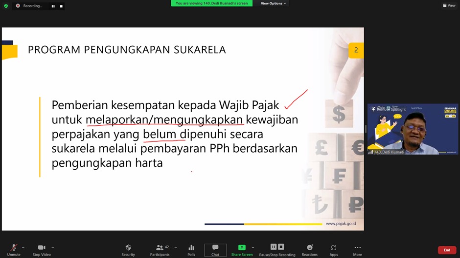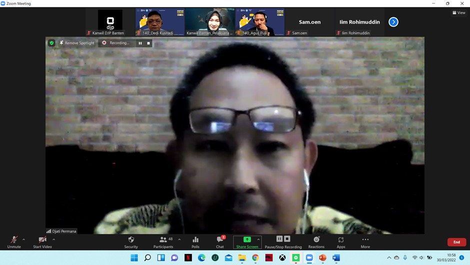 Kantor Wilayah (Kanwil) Direktorat Jenderal Pajak (DJP) Banten kembali mengadakan sosialisasi Undang-Undang Harmonisasi Peraturan Perpajakan (UU HPP) dan Program Pengungkapan Sukarela (PPS) kepada para anggota Gabungan Pelaksana Konstruksi (Gapensi) Banten secara daring melalui aplikasi Zoom Cloud Meeting di Kota Serang, Banten (Rabu, 30/3).