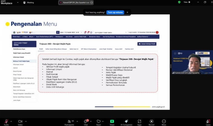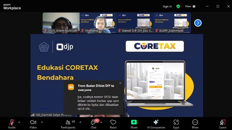 Kantor Wilayah Direktorat Jenderal Pajak Daerah Istimewa Yogyakarta (Kanwil DJP DIY) menyelenggarakan kegiatan edukasi Coretax kepada para bendahara di lingkungan Pemerintah Daerah (Pemda) DIY (Rabu, 11/12). Kegiatan edukasi dilaksanakan secara daring dan diikuti oleh 100 peserta.
