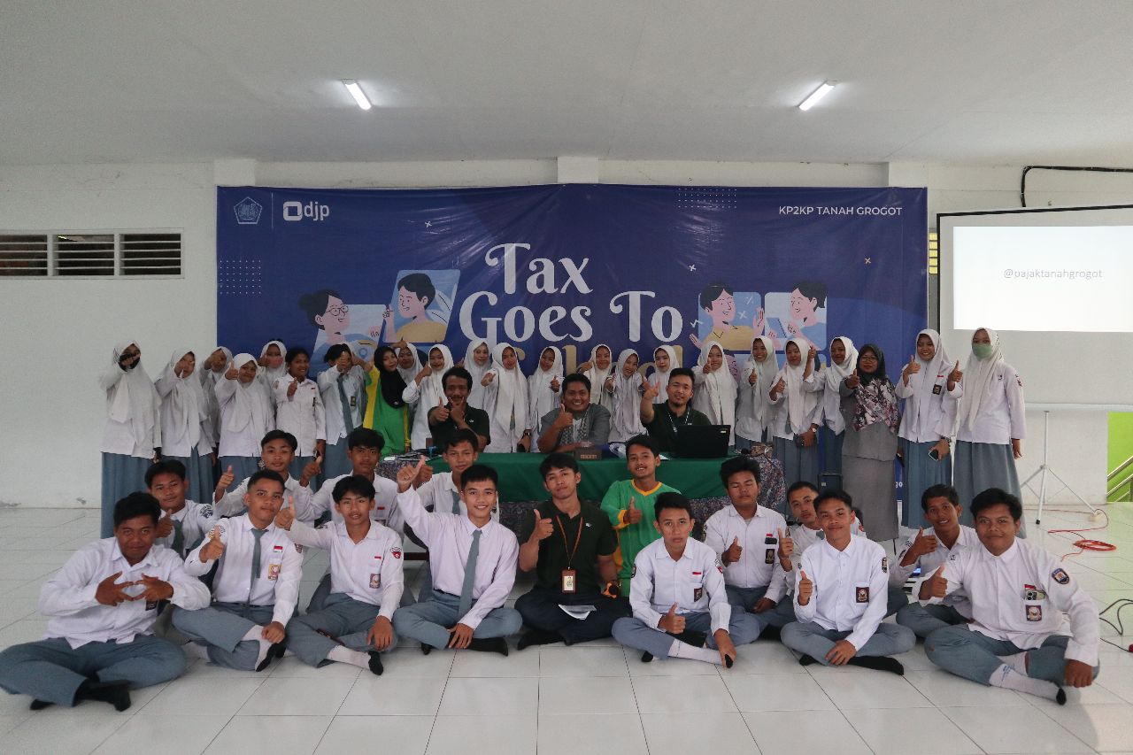 Kantor Pelayanan, Penyuluhan, dan Konsultasi Perpajakan (KP2KP) Tanah Grogot melaksanakan kegiatan Tax Goes To School secara tatap muka yang diikuti oleh 40 siswa Sekolah Menengah Kejuruan (SMK) Muhammadiyah Long Ikis di Jalan Negara KM. 84, Long Ikis, Kab. Paser, Kalimantan Timur (Selasa, 16/5).