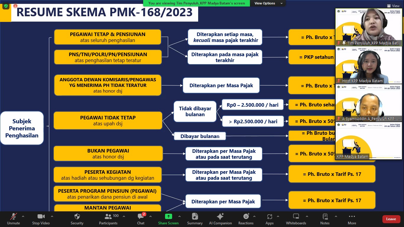 Kantor Pelayanan Pajak (KPP) Madya Batam mengadakan Kelas Pajak secara daring seri Peraturan Pemerintah (PP) Nomor 58 Tahun 2023 (PP-58/2023) di Kota Batam, Kepulauan Riau (Kamis, 1/2). Kelas Pajak dibagi menjadi dua, sesi 1 pukul 10.00 s.d. 11.30 WIB dan sesi 2 pukul 14.00 s.d. 15.30 WIB. Kelas Pajak dihadiri oleh 100 peserta di tiap sesi yang sebagian besar merupakan perwakilan dari Wajib Pajak Badan pemberi kerja yang terdaftar di KPP Madya Batam.