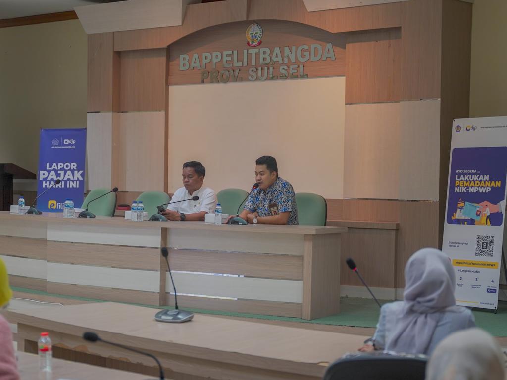Kantor Pelayanan Pajak (KPP) Pratama Makassar Selatan bekerja sama dengan Badan Perencanaan dan Penelitian Pengembangan Pembangunan Daerah (Bappelitbangda) Provinsi Sulawesi Selatan menyelenggarakan kegiatan edukasi dan asistensi pemadanan Nomor Induk Kependudukan (NIK) sebagai Nomor Pokok Wajib Pajak (NPWP) serta penyampaian Surat Pembertahuan (SPT) Tahunan PPh Orang Pribadi Tahun 2022 (Jumat, 3/2). Edukasi dan asistensi diberikan kepada seluruh pegawai Bappelitbangda Provinsi Sulawesi Selatan di Aula Bappelitbangda, Kota Makassar.