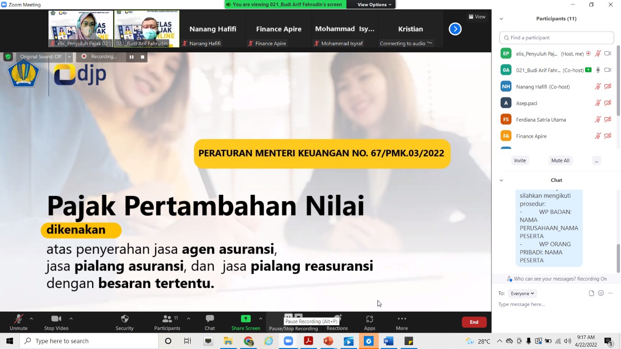 Materi yang dipaparkan oleh tim penyuluh KPP Pratama Jakarta Menteng Satu mengenai Peraturan Menteri Keuangan Nomor PMK-67/PMK.03/2022 Tentang PPN Penyerahan Jasa Agen Asuransi, Jasa Pialang Asuransi, dan Jasa Pialang Reasuransi.