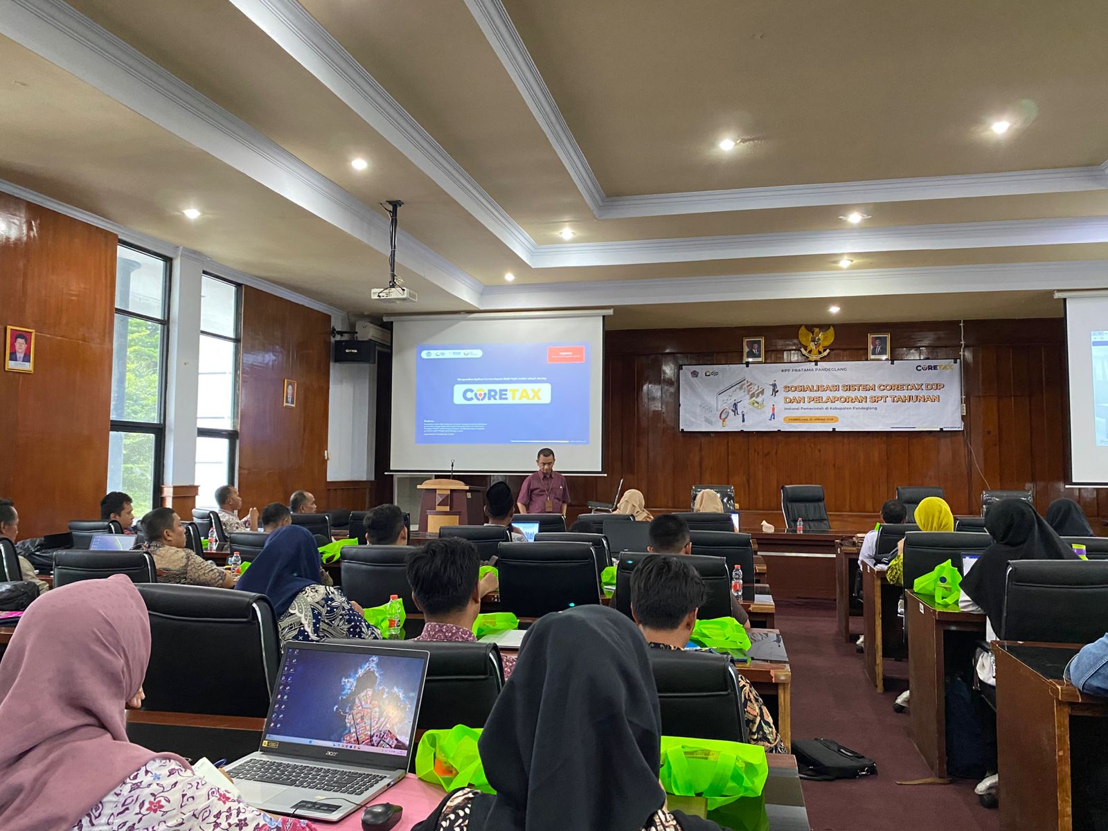 Kantor Pelayanan Pajak (KPP) Pratama Pandeglang menggelar kegiatan Edukasi Coretax kepada bendaharawan Instansi Pemerintah Daerah di Aula Badan Pengelola Keuangan Daerah (BPKD) Kabupaten Pandeglang (Kamis, 23/1). Kegiatan ini bertujuan untuk memberikan pemahaman lebih dalam kepada Instansi Pemerintah khususnya para bendaharawan terkait pengenalan Coretax DJP serta prosedur pembuatan Bukti Potong Pajak 1721-A2.