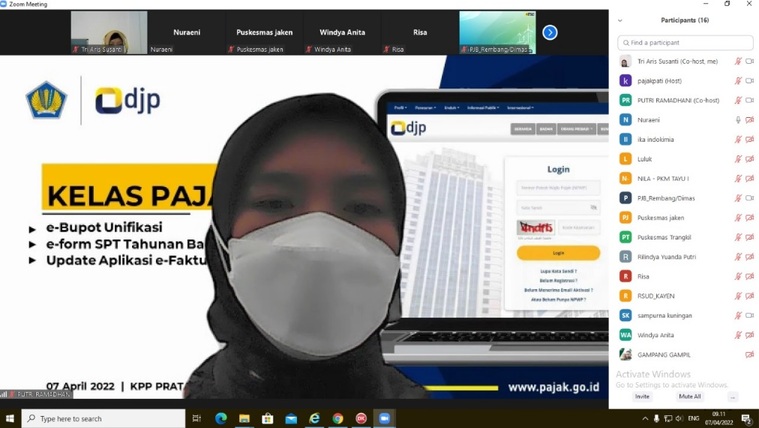 Kantor Pelayanan Pajak (KPP) Pratama Pati mengadakan kelas pajak secara daring melalui aplikasi Zoom Meeting dengan tema bahasan e-Bupot Unifikasi, e-Form Surat Pemberitahuan (SPT) Tahunan Badan dan Update e-Faktur di Pati (Kamis, 07/04).