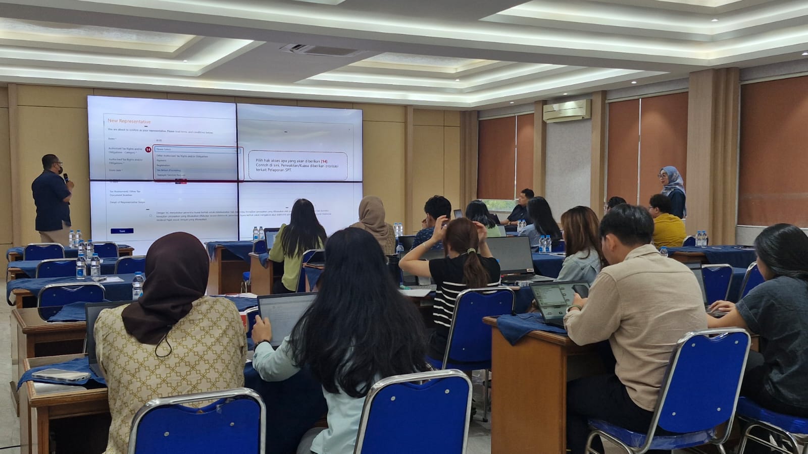 Acara dilanjutkan pemaparan materi serta simulasi dan praktik aplikasi yang antara lain berupa materi perubahan data wajib pajak, deposit pajak, pembayaran pajak, faktur pajak, e-Bupot, Surat Pemberitahuan (SPT) Masa Pajak Penghasilan (PPh) dan Pajak Pertambahan Nilai (PPN), serta SPT Tahunan yang disampaikan Tim Edukator Coretax KPP Pluit. Kemudian dilanjutkan diskusi dengan peserta mengenai pemaparan materi yang telah dipaparkan dan kendala yang ditemui ketika melakukan simulasi.