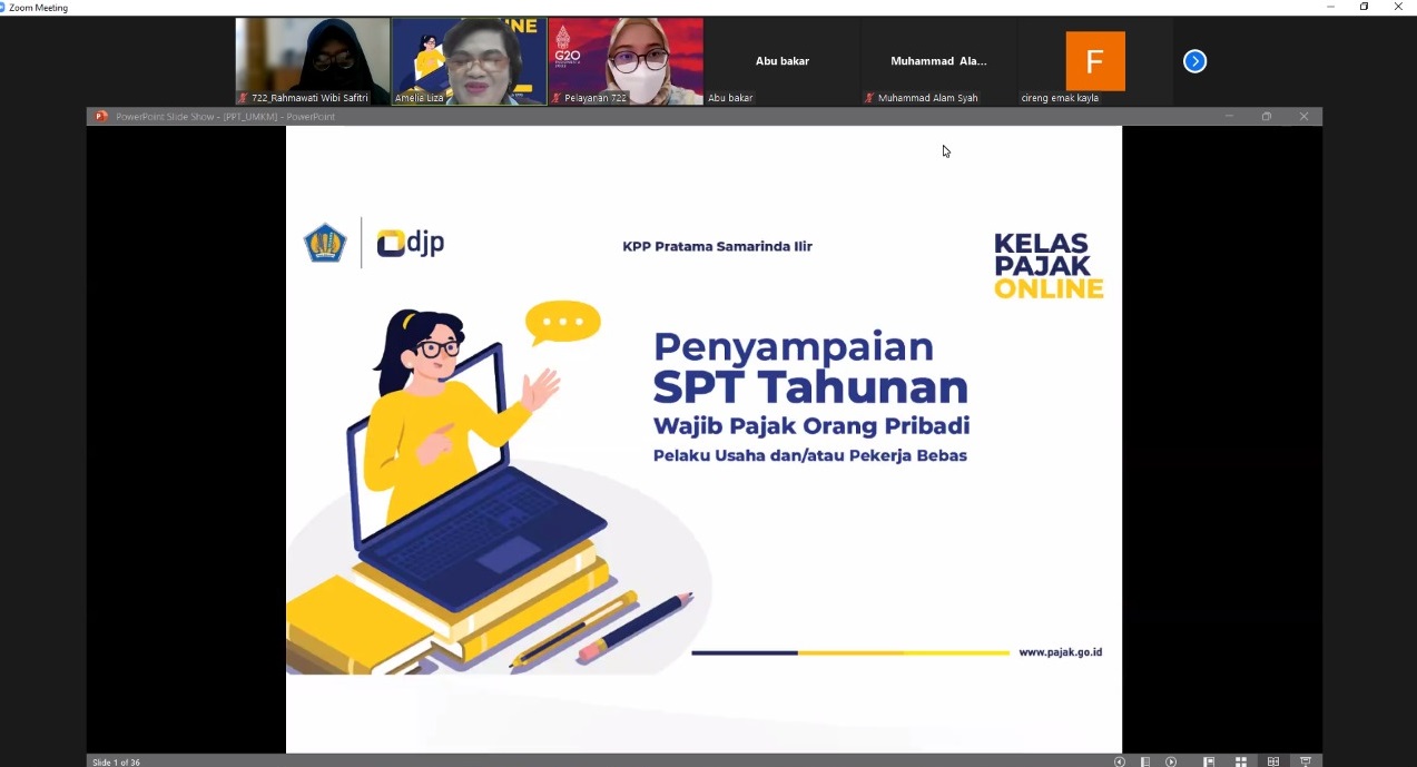 Kantor Pelayanan Pajak Pratama (KPP) Pratama Samarinda Ilir menyelenggarakan kegiatan kelas pajak secara daring via Zoom Meeting di Kota Samarinda (Rabu, 23/03). Kelas Pajak dengan tema Penyampaian Surat Pemberitahuan (SPT) Tahunan Wajib Pajak Orang Pribadi Pelaku Usaha dan/atau Pekerja Bebas dihadiri oleh pelaku Usaha Mikro, Kecil, dan Menengah (UMKM) Samarinda.