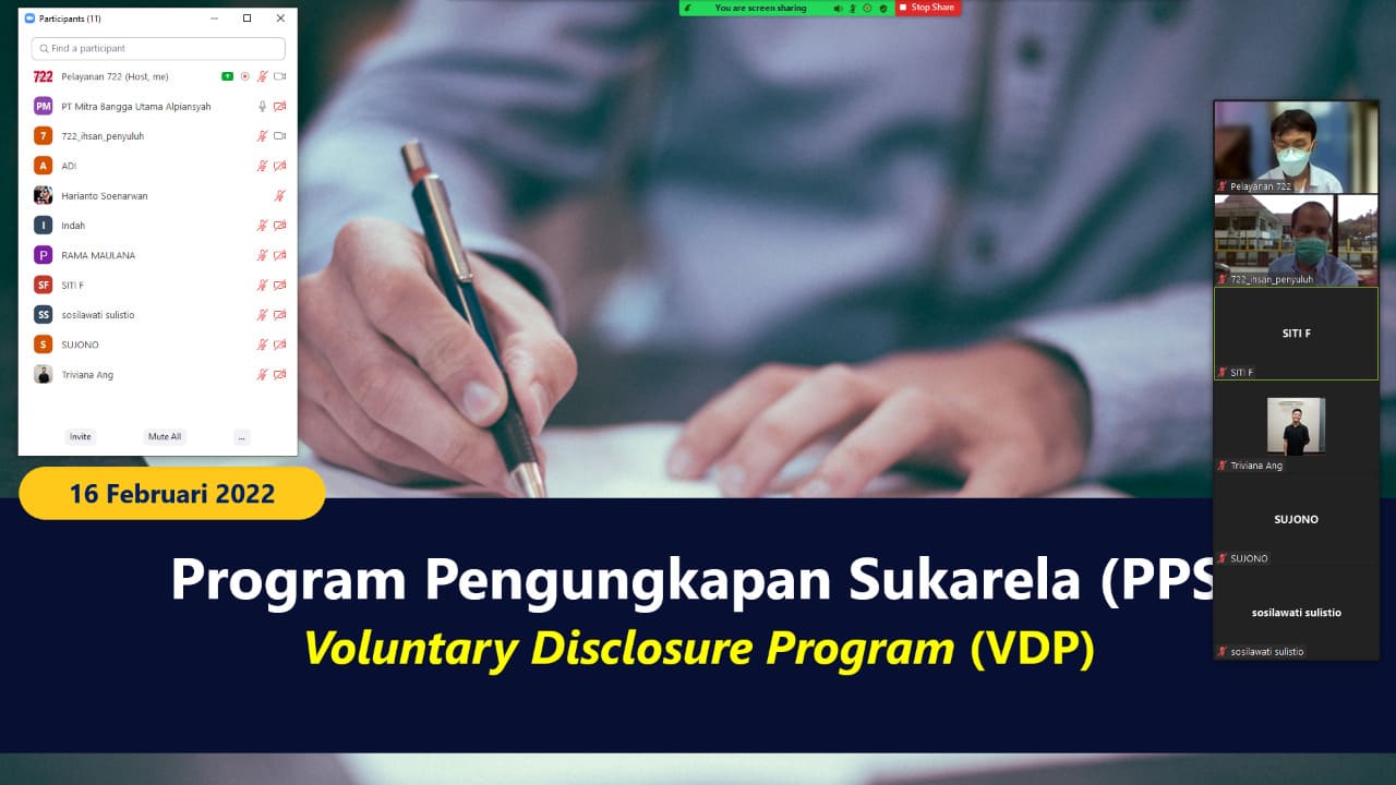 Kantor Pelayanan Pajak (KPP) Pratama Samarinda Ilir kembali menggelar kegiatan penyuluhan dengan tema “Sosialisasi Program Pengungkapan Sukarela” secara daring melalui Aplikasi Zoom Meeting di Kota Samarinda (Rabu, 16/2). Kegiatan sosialisasi ini diikuti oleh 16 peserta.