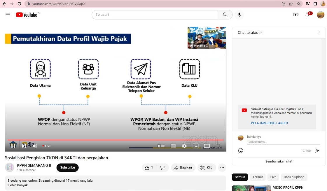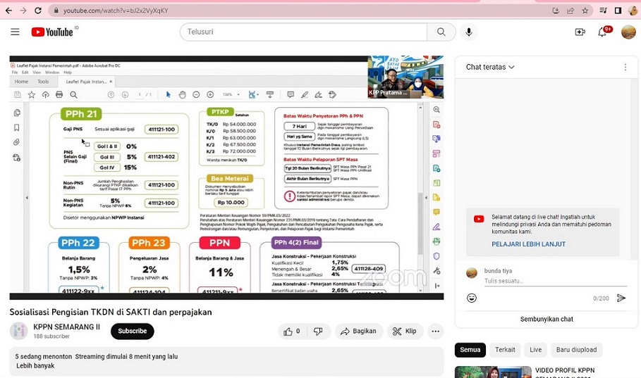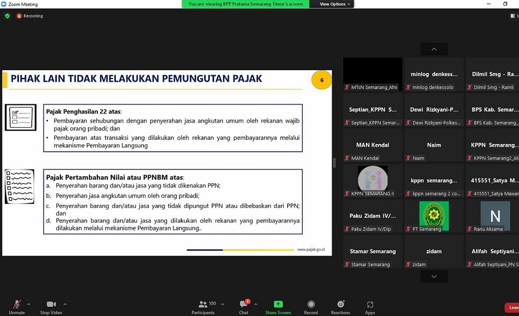 Kegiatan yang dilaksanakan secara daring melalui aplikasi Zoom Cloud Meeting dan live Youtube KPPN Semarang II diikuti oleh 159 Bendahara Pengeluaran Satuan Kerja Mitra Kerja KPPN Semarang II dan bertujuan untuk percepatan peningkatan penggunaan produk dalam negeri dan peningkatan pemahaman bendahara pengeluaran atas kewajiban pemotongan dan pemungutan.